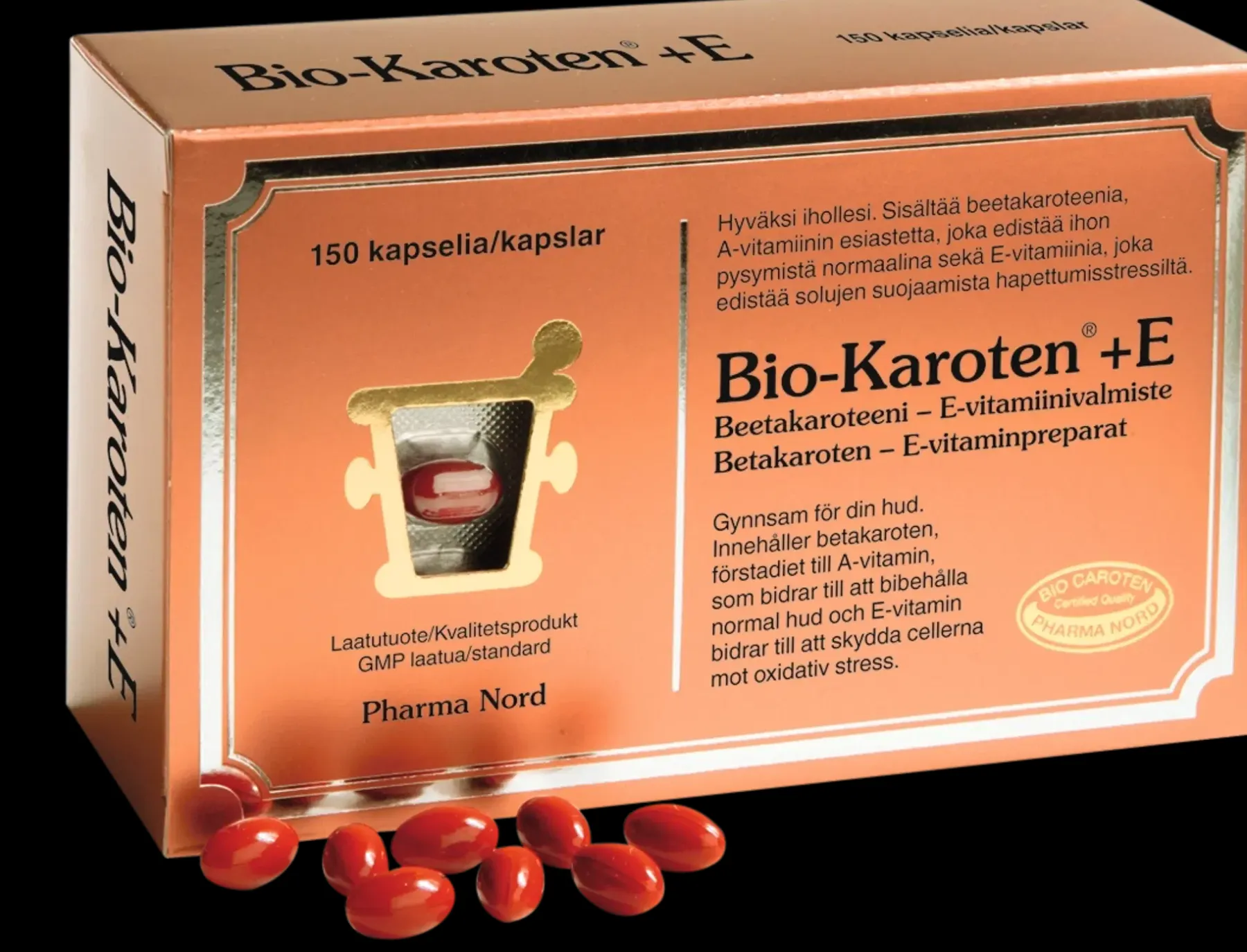 Bio-Karoten® + E sisältää beetakaroteenia tasaisessa kasvipohjaisessa öljyliuoksessa, josta beetakaroteeni imeytyy hyvin. Valmisteen E-vitamiini on d-alfa muodossa.