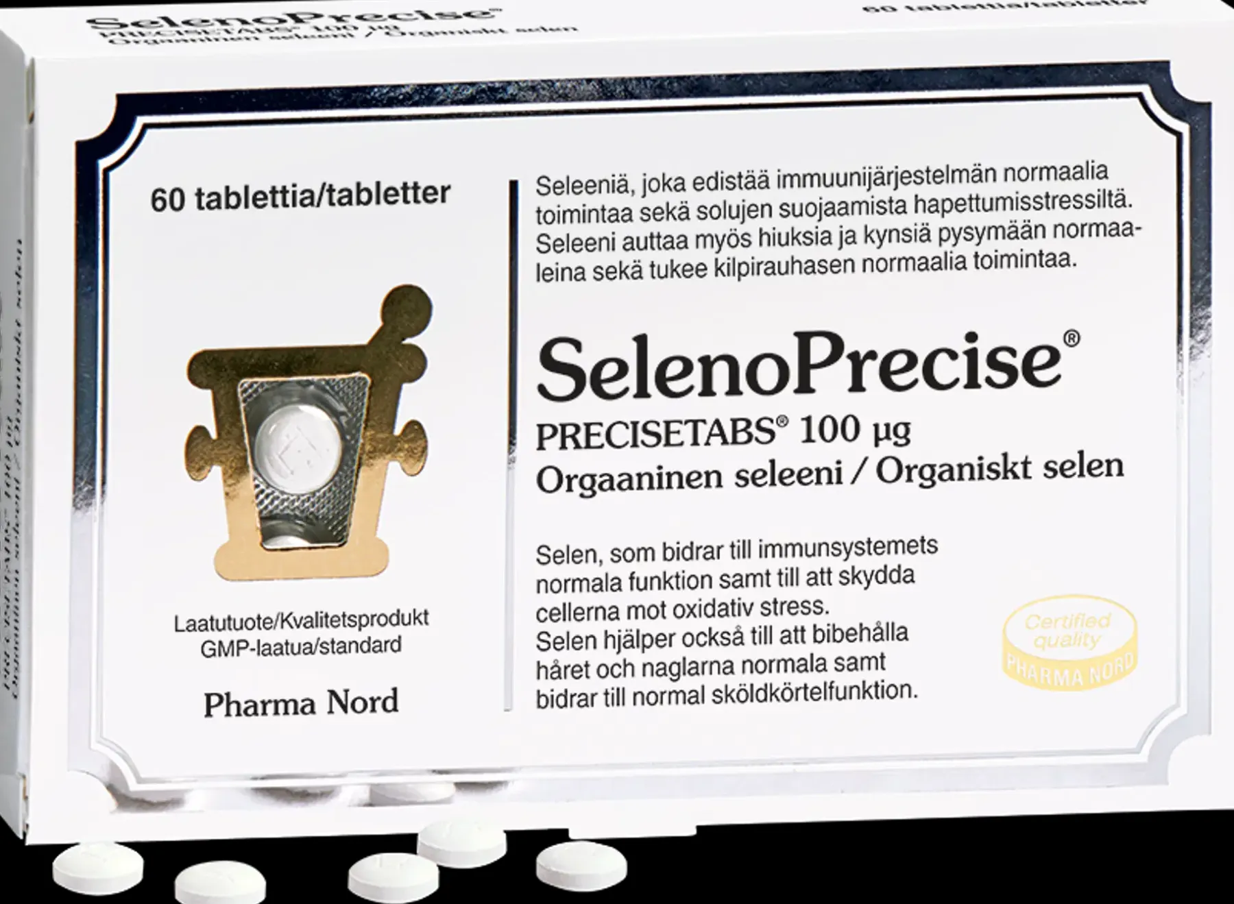 Pharma Nordin Tanskassa tuottama SelenoPrecise on dokumentoitu yli 40:ssä julkaistussa tieteellisessä tutkimuksessa. Kaikkiaan 15 laboratoriota 12:ssa eri maassa on mitannut L-seleenimetioniinin, hyvin dokumentoidun seleeniyhdisteen, pitoisuuden olevan 67 %. L-seleenimetioniinia pidetään turvallisimpana saatavilla olevista seleenilähteistä.