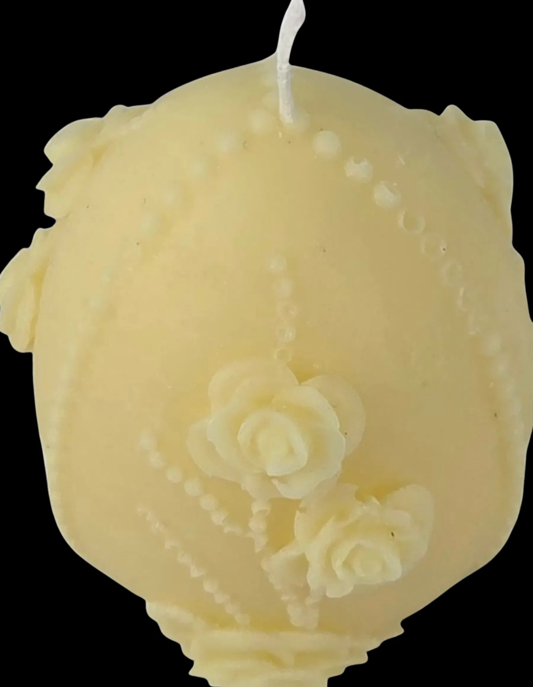Kynttilän koristeellinen munamuoto ja ruusukuviointi tekevät siitä näyttävän sisustuselementin, ihastuttavan pääsiäistuliaisen ja täydellisen lahjan kevään juhliin.