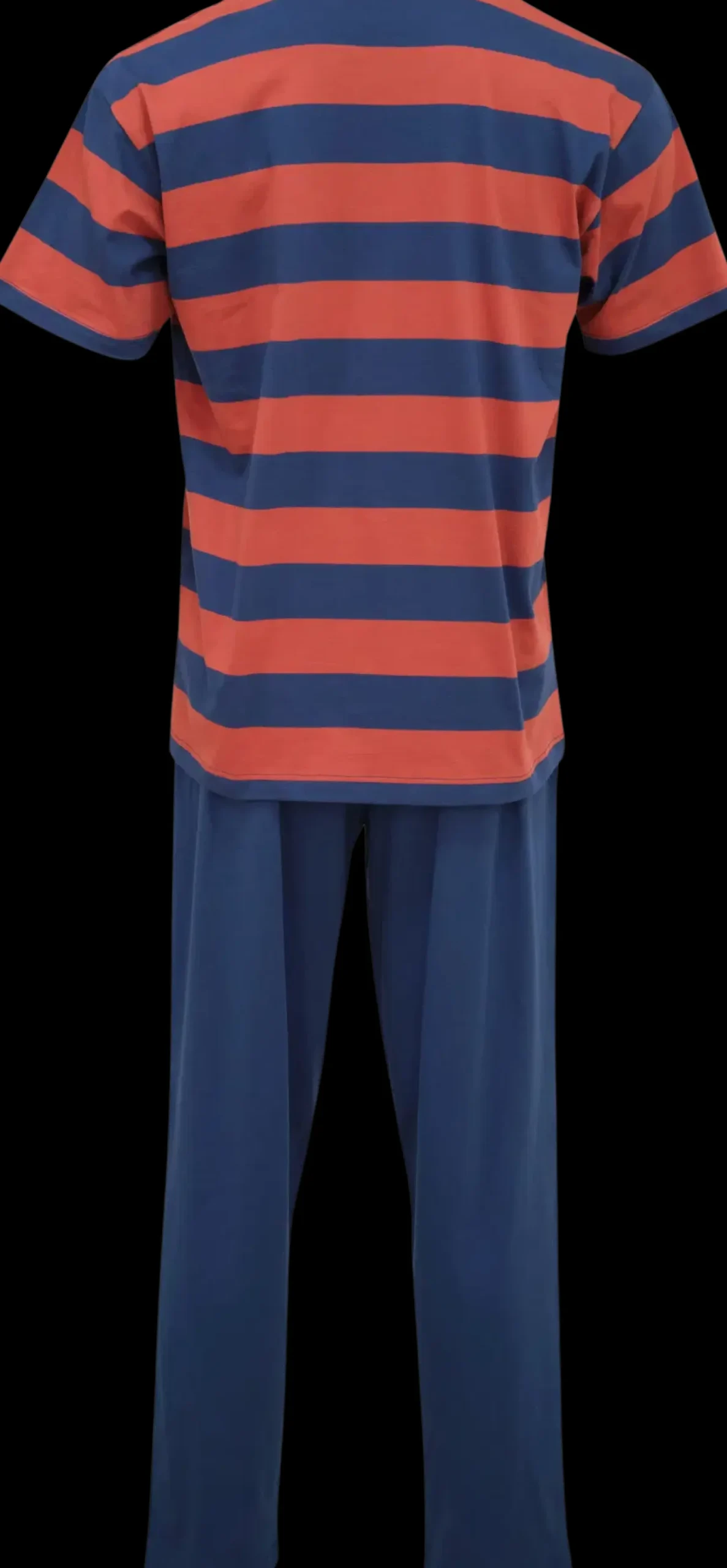 RATIA® pyjama. Raidallinen t-paita paita ja yksiväriset pitkälahkeiset housut, joissa kuminauha vyötäröllä ja suorat lahkeensuut. Materiaali laadukasta 100% puuvillatrikoota. Tuotteella on Suomalaisen Työn Liiton, Design From Finland–merkki. Valmistettu Portugalissa.