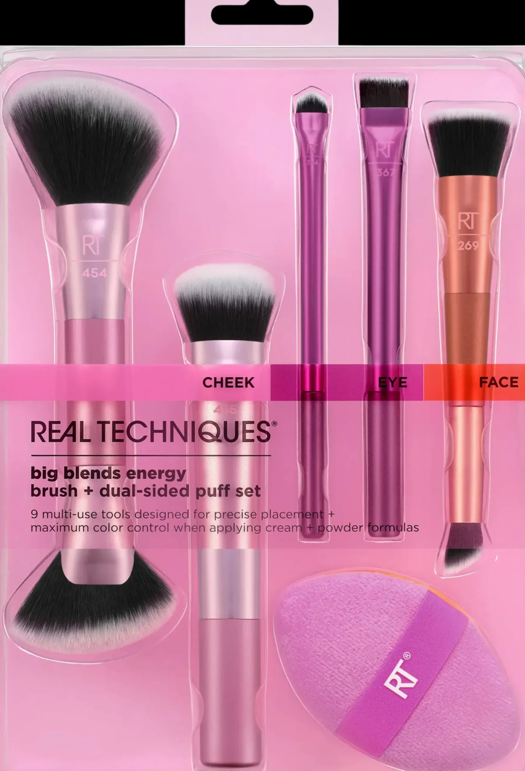 Real Techniques Big Blends Energy Makeup Brush + Dual-Sided Puff Set sisältää 9 monikäyttöistä meikkivälinettä, jotka on suunniteltu tarkkaan levitykseen ja maksimaaliseen värinhallintaan. Settiin kuuluvat: 454 Angled Fan Finishing Brush, 455 Cat Paw Blush Brush, 364 Pyramid Liner Brush, 367 Layer + Liner Eye Brush, 269 Flat Concealer + Contour Brush sekä Miracle 2-in-1 Powder Puff. Ammattitasoiset siveltimet sopivat käytettäväksi kaikkien suosikkivoiteidesi ja -puuteriesi kanssa. Meikkisienessä on kaksi puolta, jotka mahdollistavat nestemäisten, voidemaisten ja puuterimaisten tuotteiden tasaisen levityksen. Molemmat puolet toimivat parhaiten kuivina käytettynä. Patentoitu kaksikärkinen muotoilu on tarkasti viistetty, jotta sillä yltää helposti kasvojen kaikkiin kohtiin – kuten silmien alle ja nenänpieliin. 100 % vegaaninen, eläinkokeeton ja valmistettu edistyksellisestä lateksittomasta vaahtoteknologiasta.