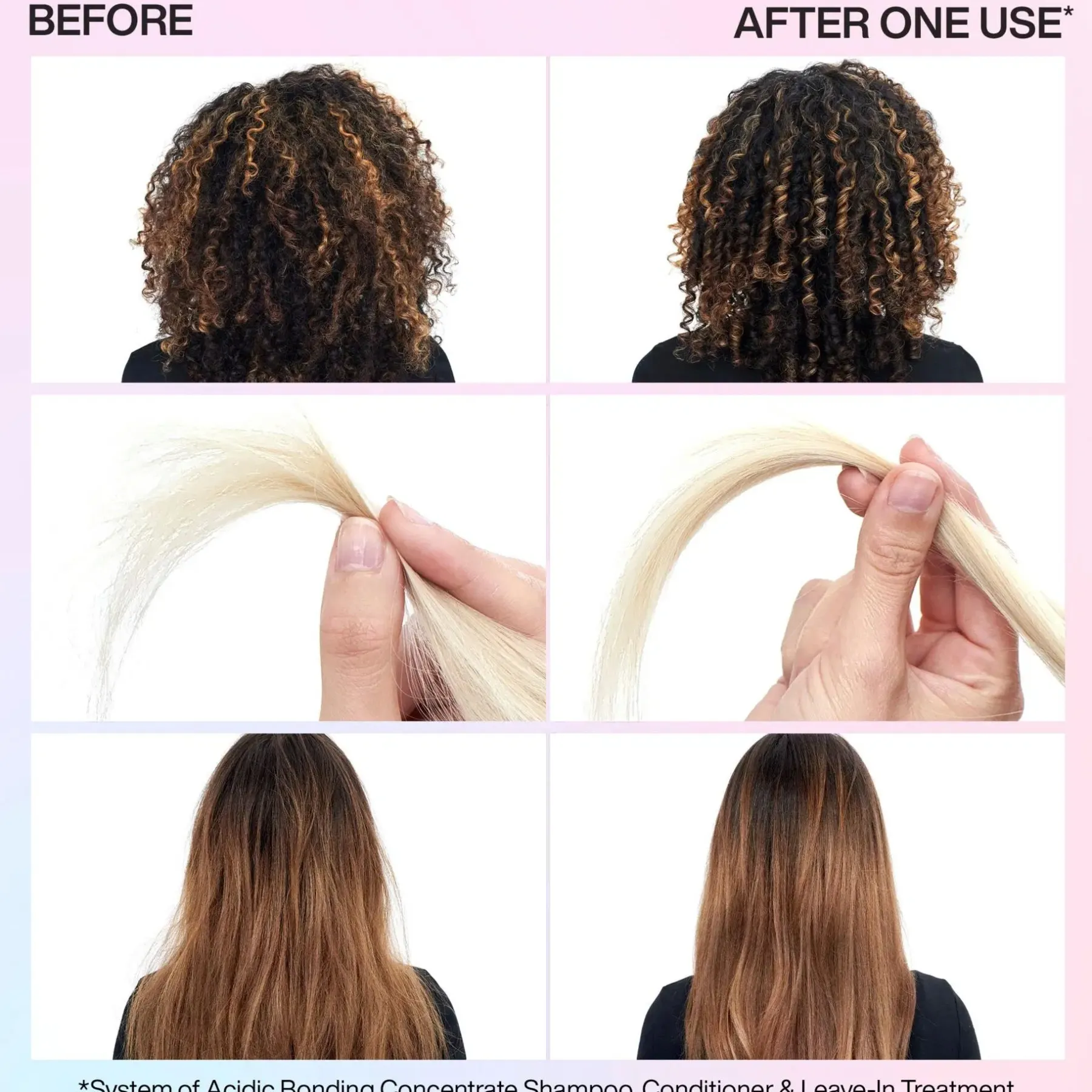 *** Käytettynä Acidic Bonding Concentrate shampoosta, hoitoaineesta ja leave-in -tuotteesta koostuvana rutiinina vs. ei-hoitava shampoo