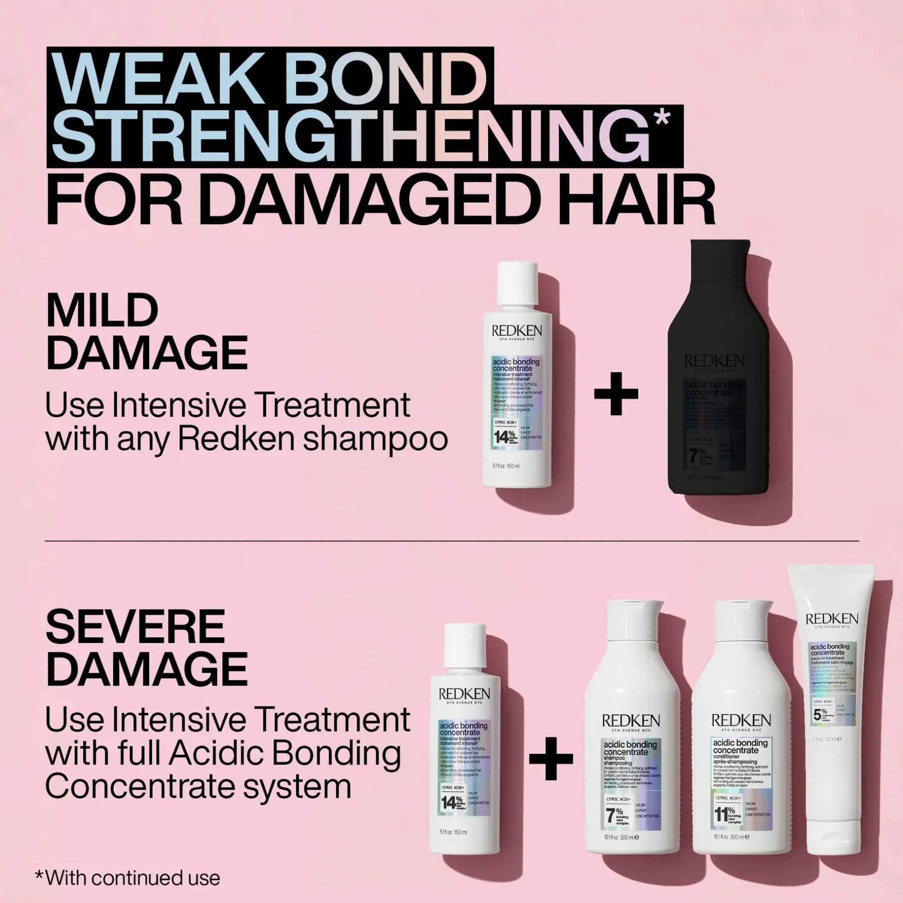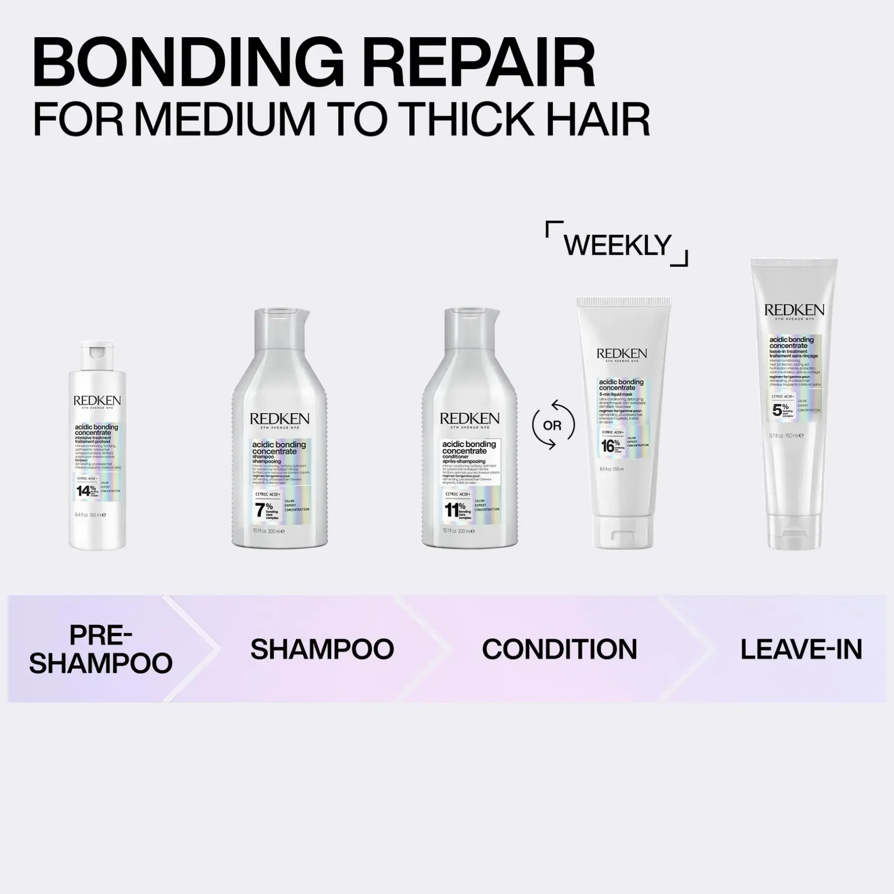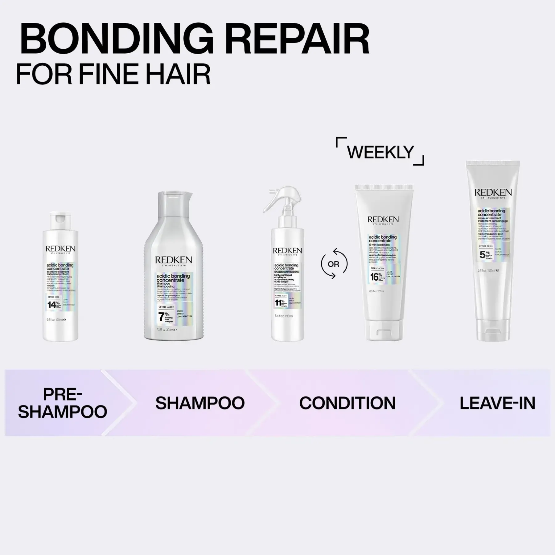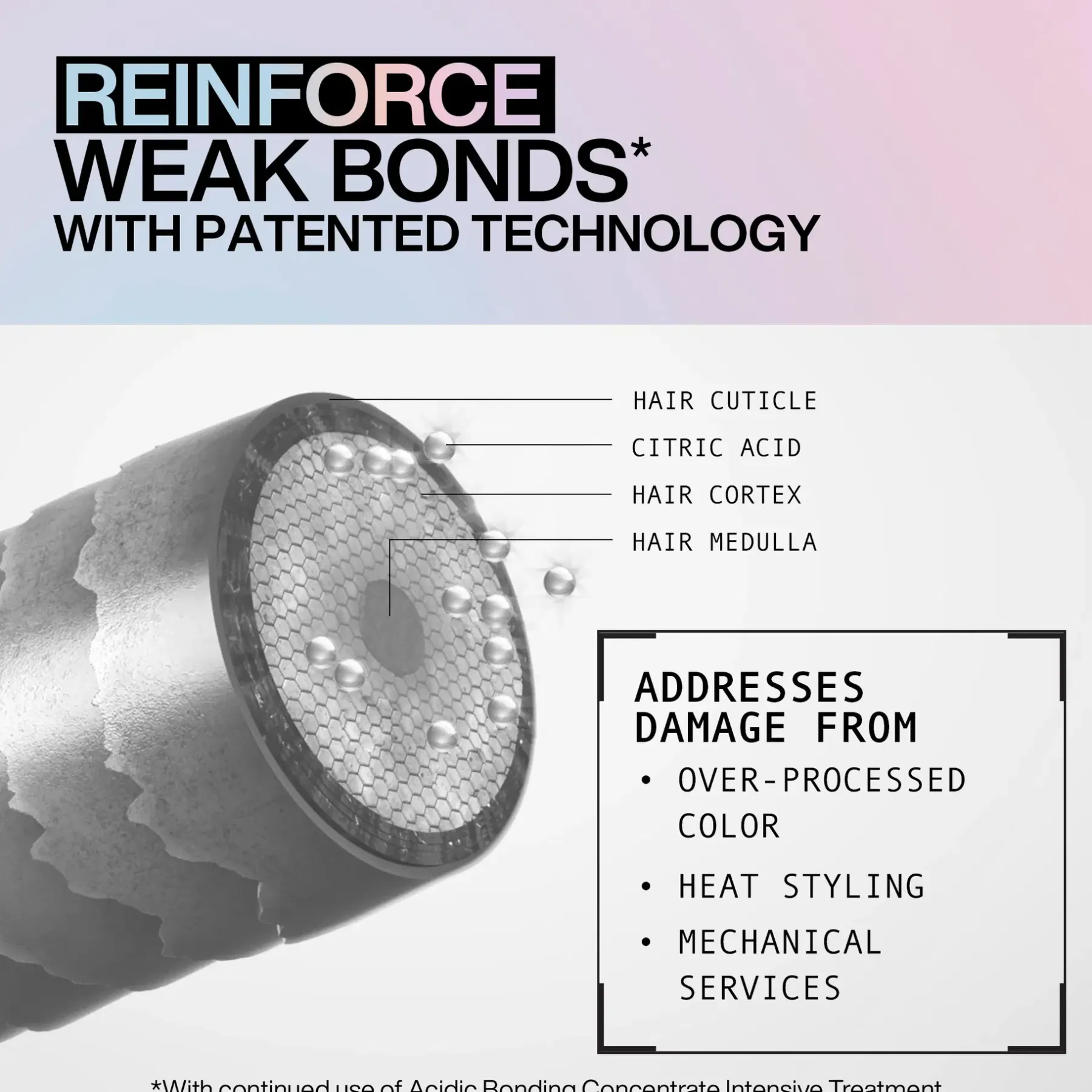 Taistele vuoden aikaisia näkyviä vaurioita vastaan yhdellä käyttökerralla* nelivaiheisella Redken Acidic Bonding Concentrate -rutiinilla.