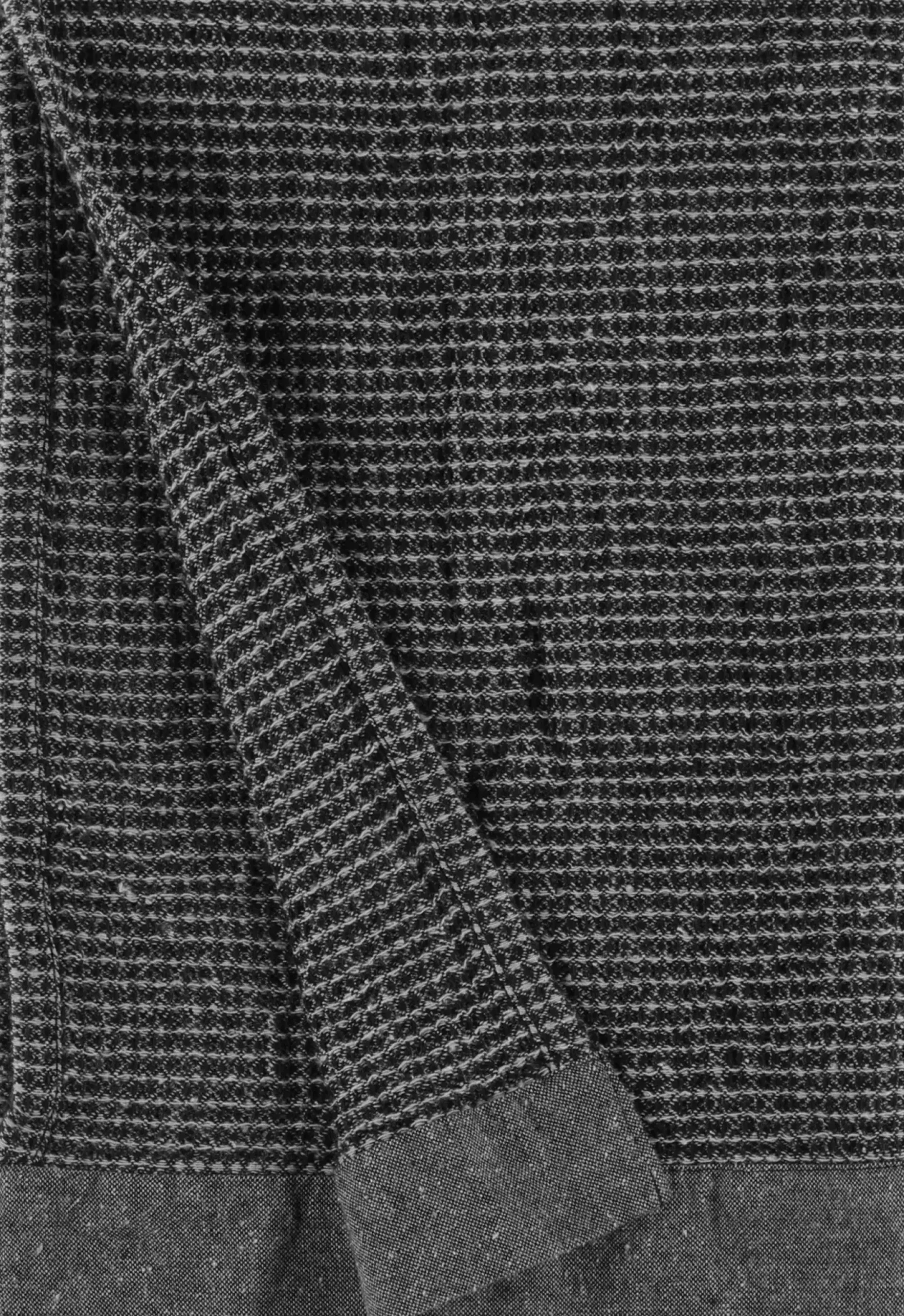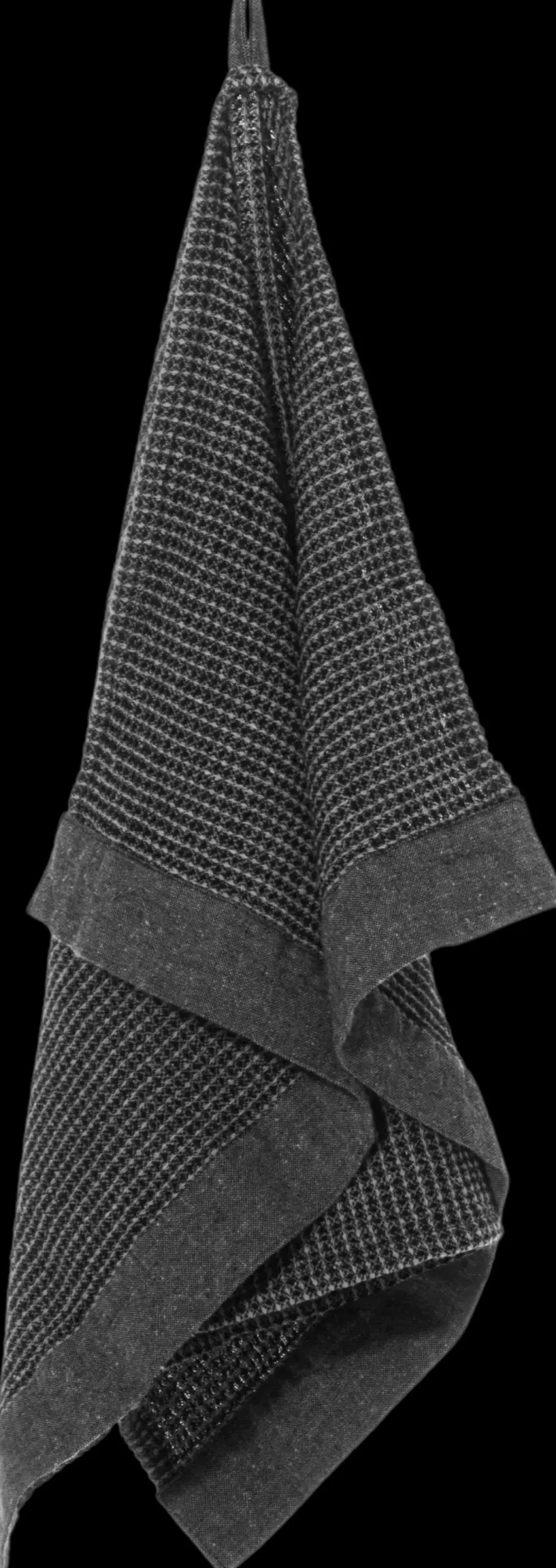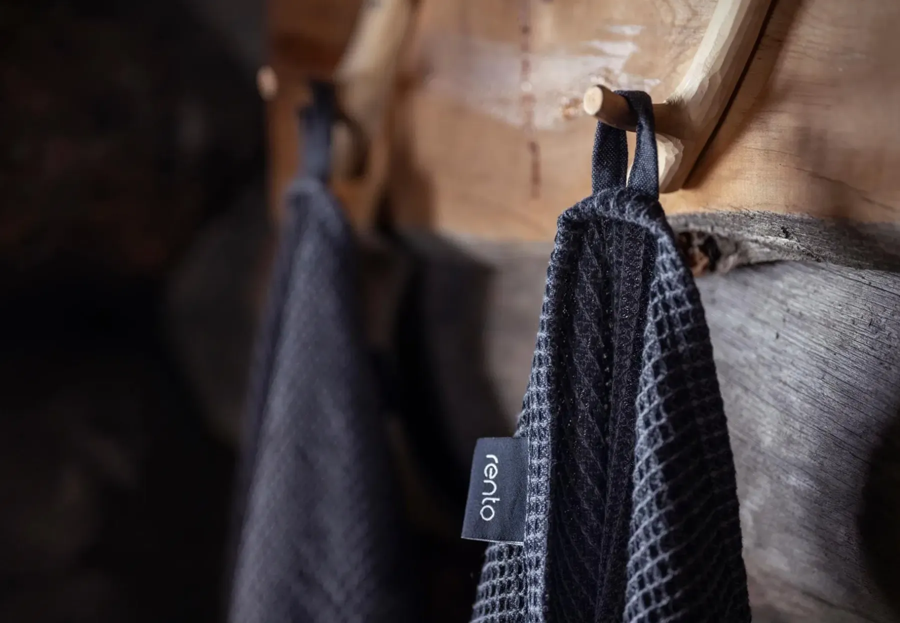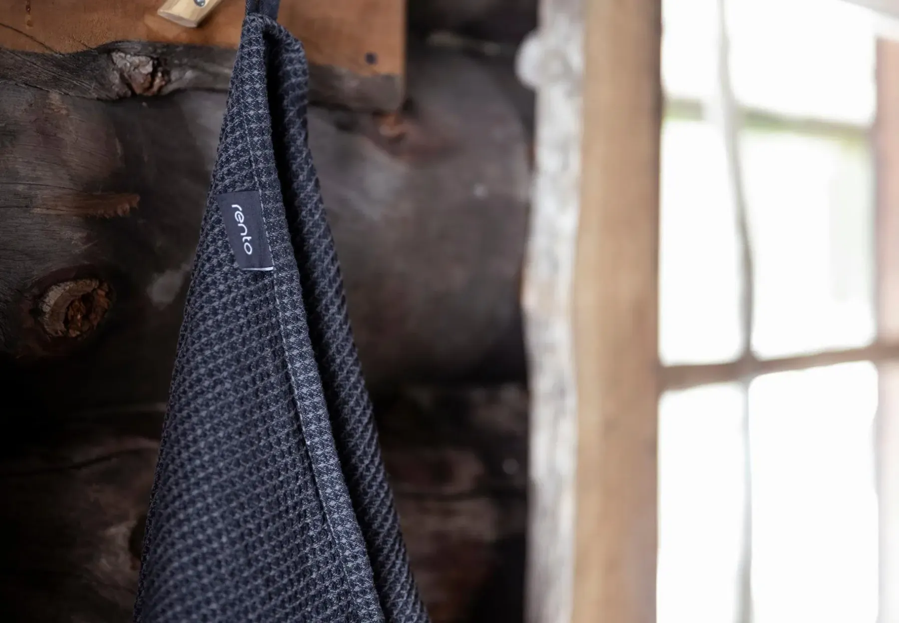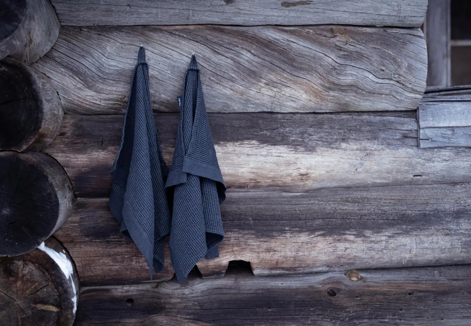 Käsipyyhe chambray-kanttauksilla. Kierrätysmateriaalista valmistetuille Kenno-saunatekstiileille on ominaista kankaan pehmeys ja eloisa tekstuuri. Varovainen vesipesu 60 astetta.