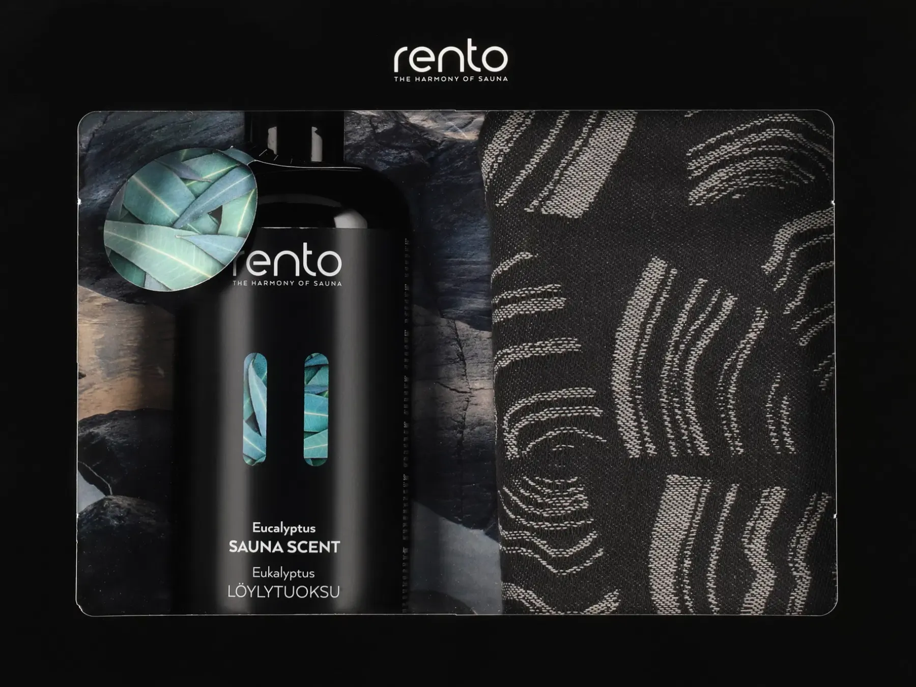 Upea lahjapakkaus nautinnollisiin saunahetkiin. Sisältää Eukalyptus löylytuoksun 400 ml ja 2 kpl 50 x 60 cm mustia luomupuuvillaisia Pino laudeliinoja.