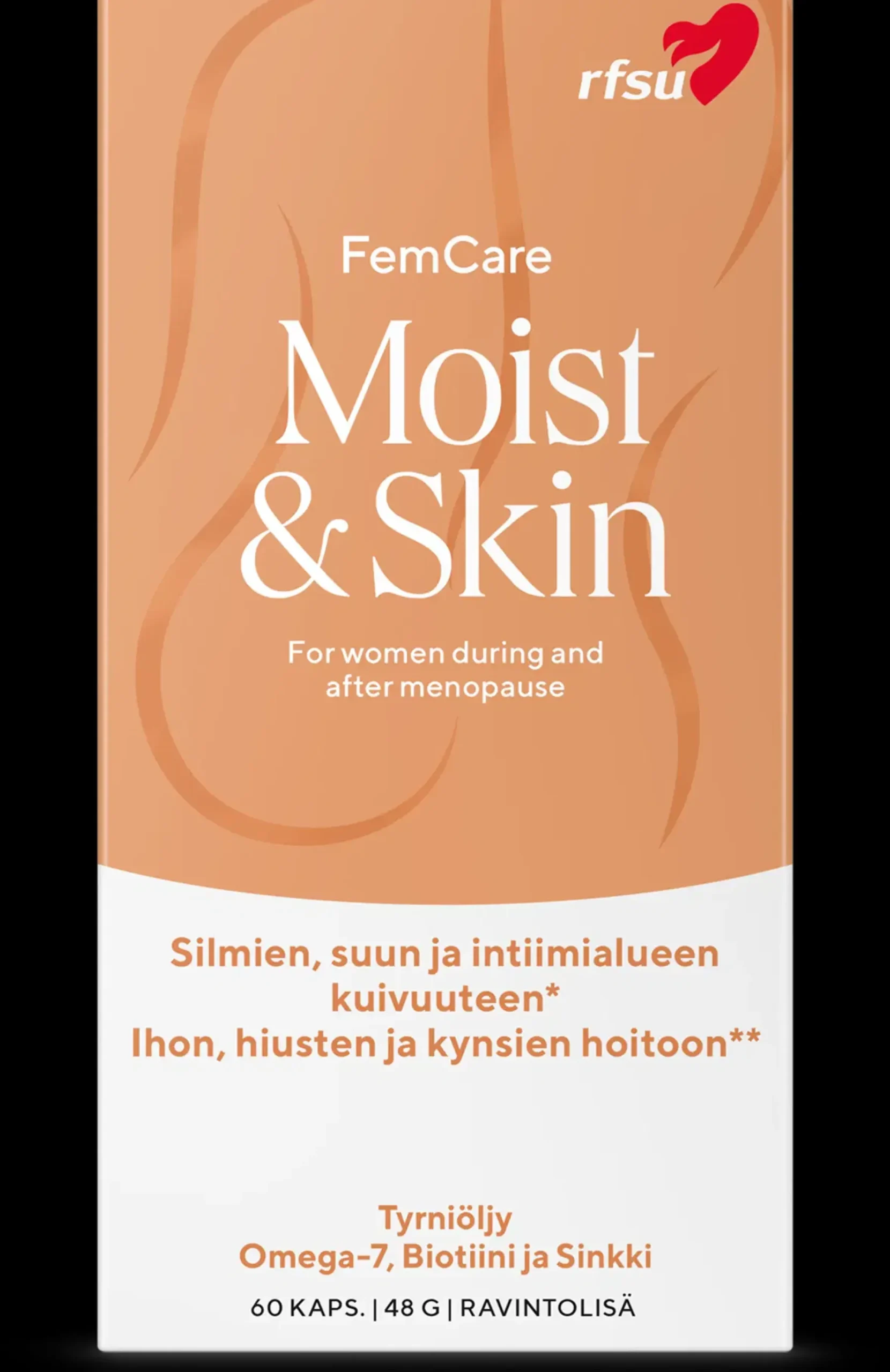 RFSU Moist&Skin on ravintolisä naisille vaihdevuosien aikana ja niiden jälkeen esimerkiksi kuiville limakalvoille, iholle, hiuksille ja kynsille. Se sisältää ainutlaatuisen yhdistelmän tyrniöljyä yhdessä biotiinin ja sinkin kanssa. Tyrniöljy tarjoaa luonnollista kosteutta limakalvoille ja iholle: se edistää limakalvojen normaalia toimintaa, kun silmät, suu ja intiimialue ovat kuivat. Biotiini auttaa ylläpitämään limakalvojen ja ihon normaalia toimintaa. Sinkki auttaa ylläpitämään hiuksia, ihoa ja kynsiä normaaleina.