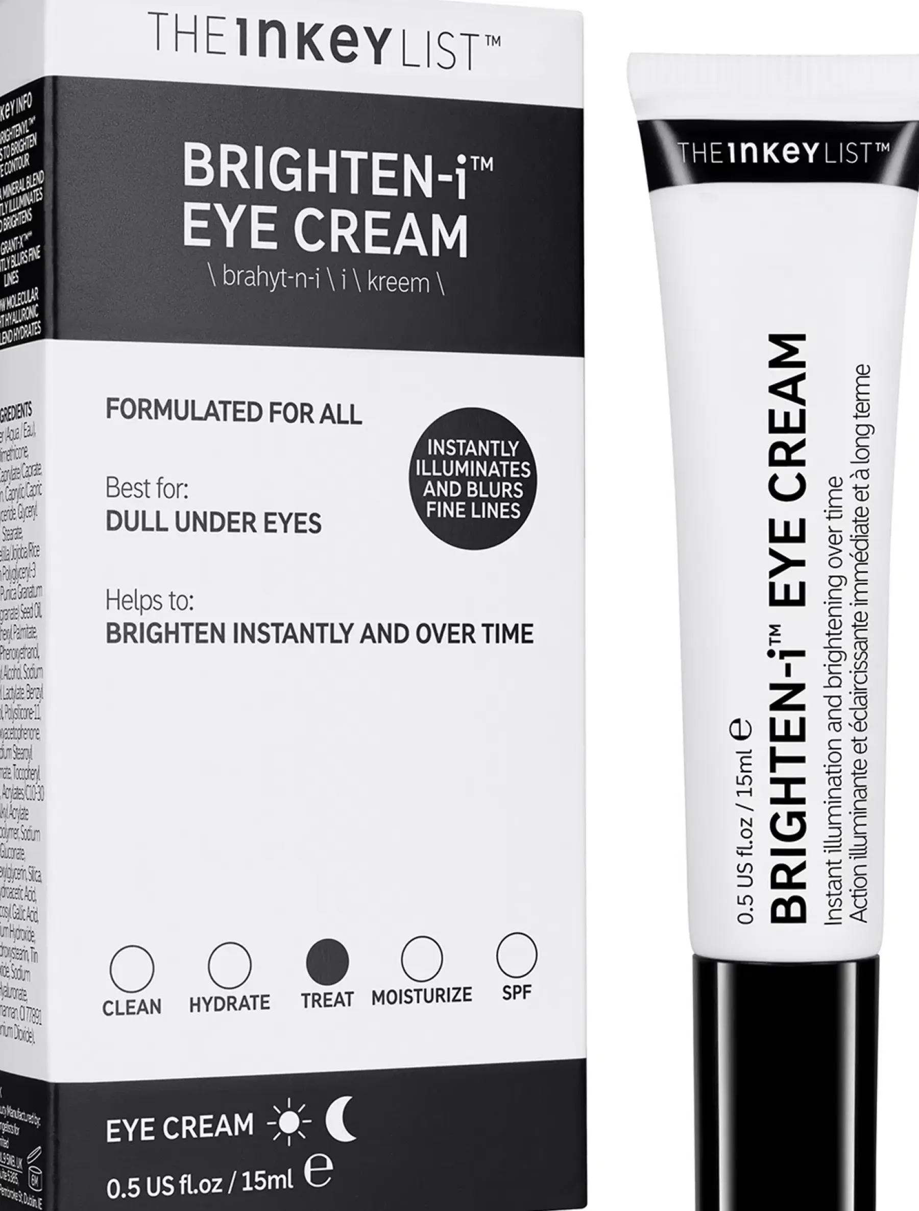 Kirkastavassa silmänympärysvoiteessa yhdistyvät ihonhoito ja kosmetiikka ja se tarjoaa sekä lyhyen että pitkän aikavälin etuja. Neljä kertaa Vitamin C:tä voimakkaampi Brighten-i -silmänympärysvoide häivyttää tummia silmänalusia ja auttaa vaalentamaan ja kirkastamaan silmänalusia ja luo ihanteellisen pohjan meikille. Viilentävä metallilevitin rauhoittaa silmänympärysaluetta ja saa silmät välittömästi heräämään.