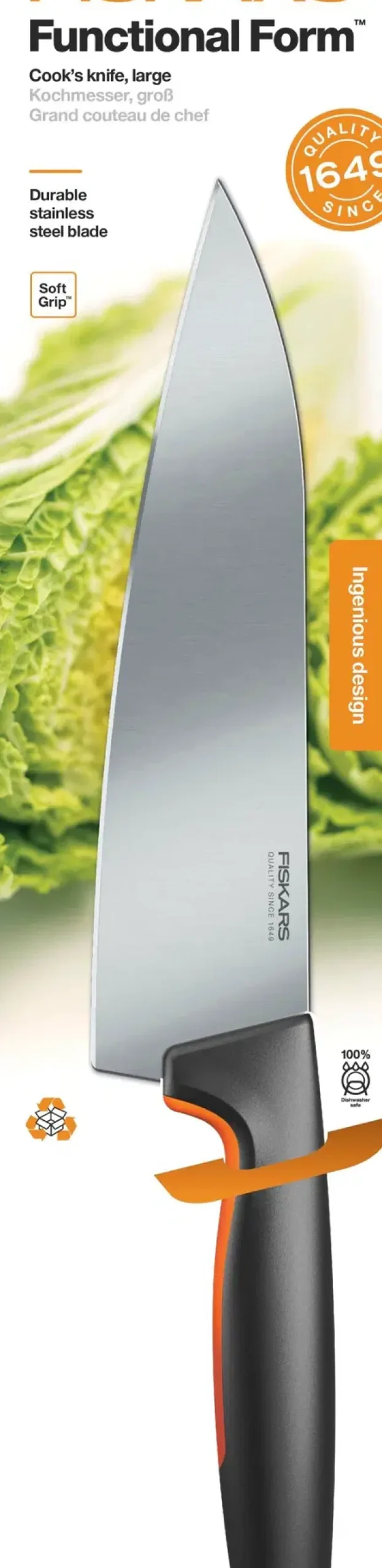 Iso yleisveitsi vahvalla terällä on ihanteellinen valinta useimpiin leikkuutehtäviin. Terä on valmistettu lujasta japanilaisesta ruostumattomasta teräksestä ja veitsen turvallisessa ja ergonomisessa kahvassa on syvä sormisuoja. Kaikki Fiskars Functional Form -veitset ovat konepestäviä.
