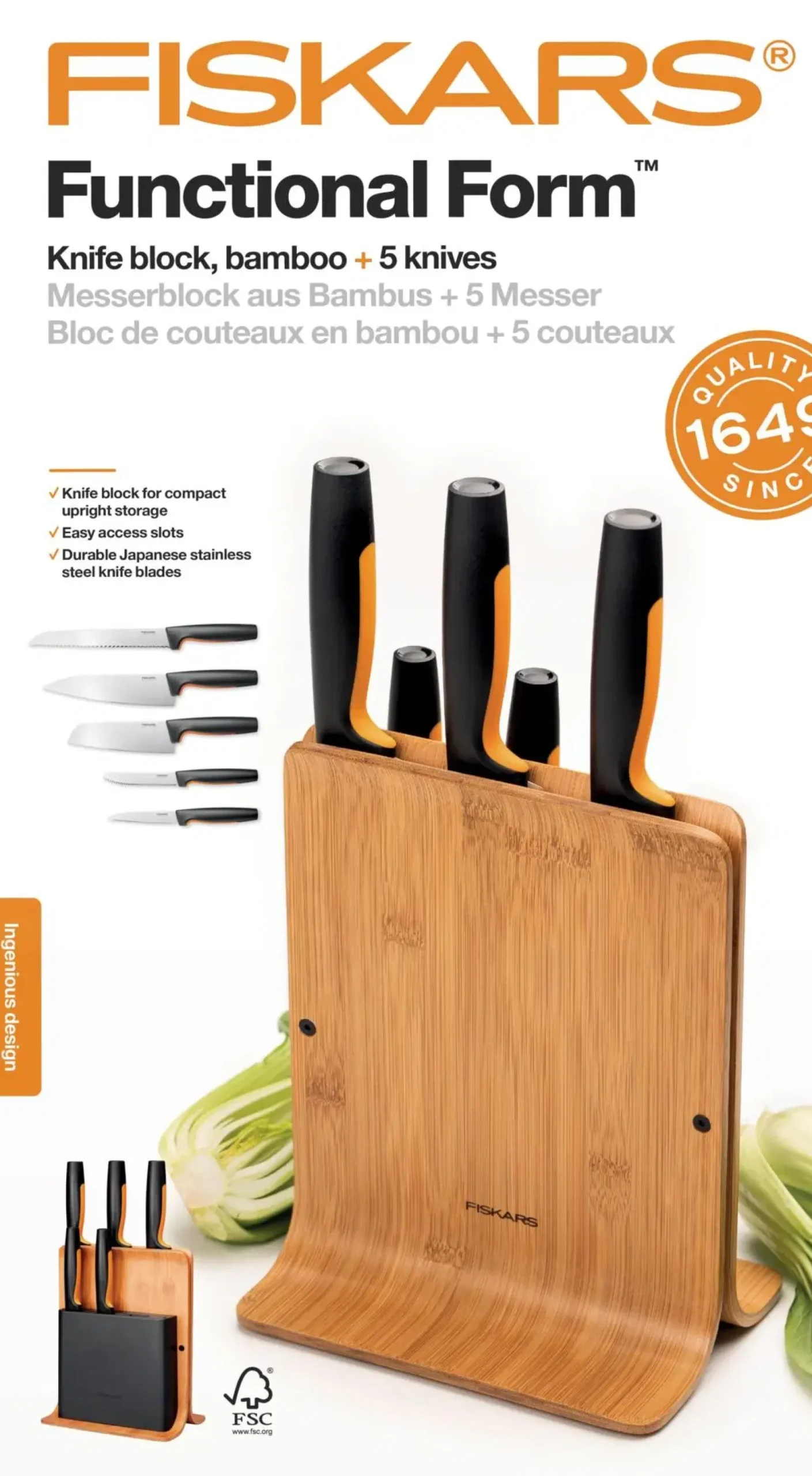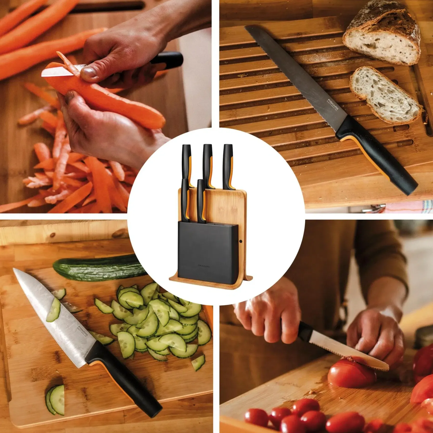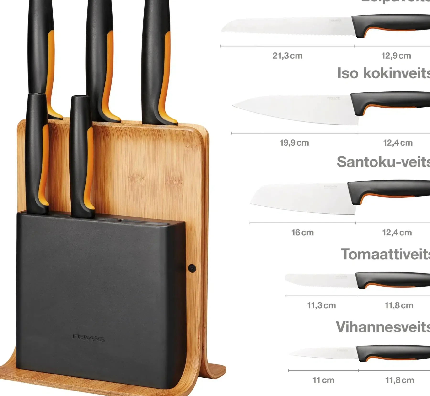 Bambusta ja muovista valmistettu veitsitukki sekä 5 tärkeintä veistä ruoanlaittoon. Kompakti pystysuuntainen säilytys ja helppokäyttöiset urat mahdollistavat tukin asettelun myös matalien kaapistojen alle.
