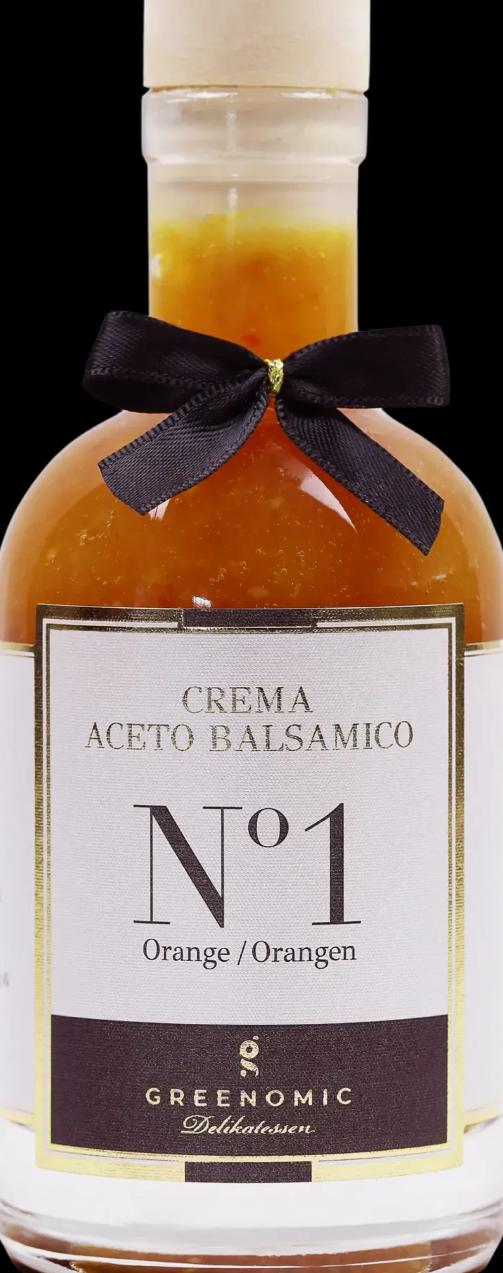 Crema Balsamico on koostumukseltaan hieman paksumpi ja soveltuu hyvin ruoka-annnosten koristeluun. Appelsiini maku. Kaunis lasipullo ruseti koristeella.