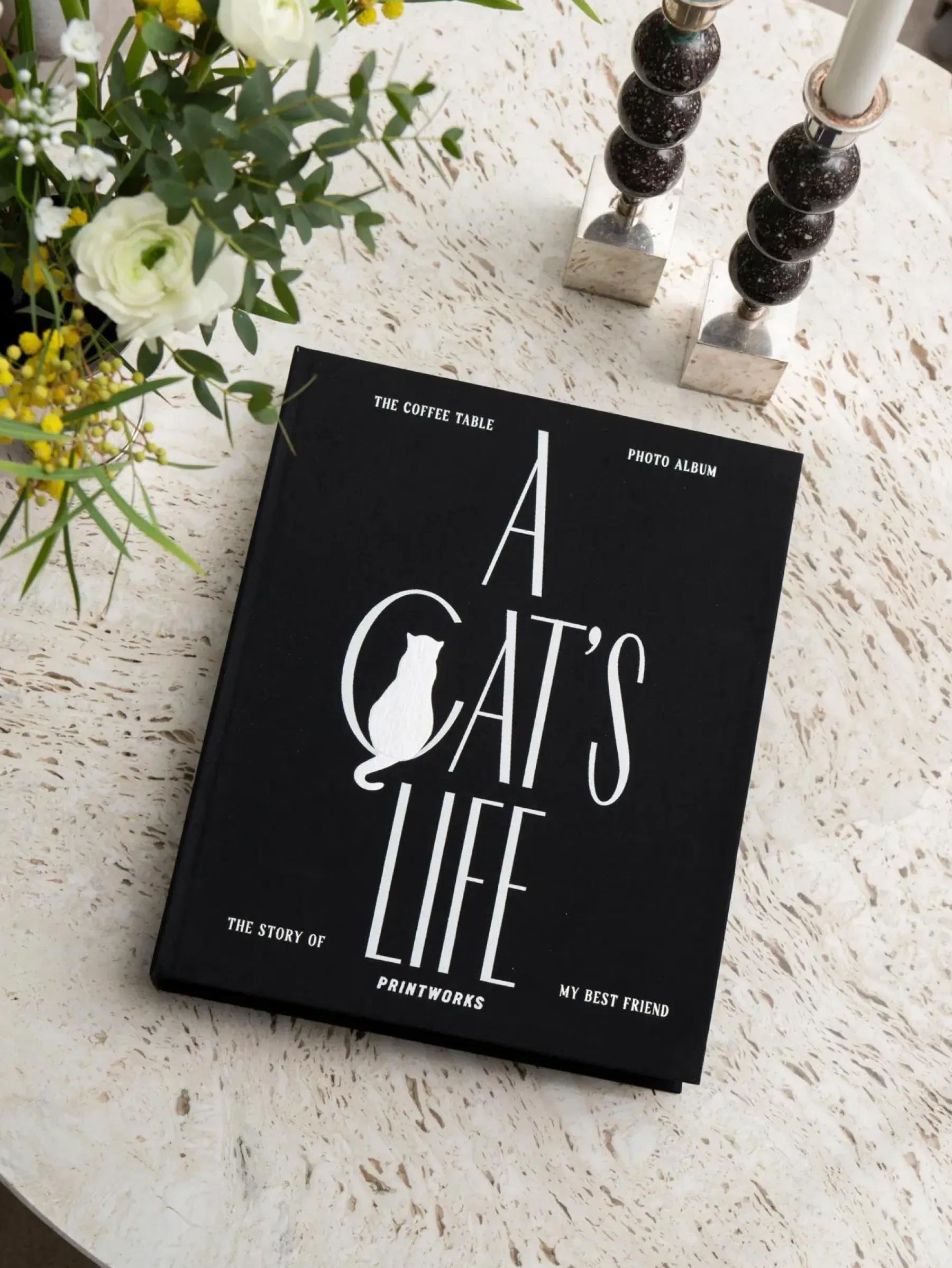 Printworksin kissa -albumissa on kaunis musta kangaskansi valkoisella tekstillä. Sisältä löydät 30 sivua korkealaatuista valkoista valokuvapaperia, johon voit helposti kiinnittää valokuviasi. Jokaiselle sivulle mahtuu kaksi 10×15 cm:n valokuvaa, ja niiden alla on tilaa henkilökohtaisille muistiinpanoille. Valokuvapaperin koko on 28×21 cm.