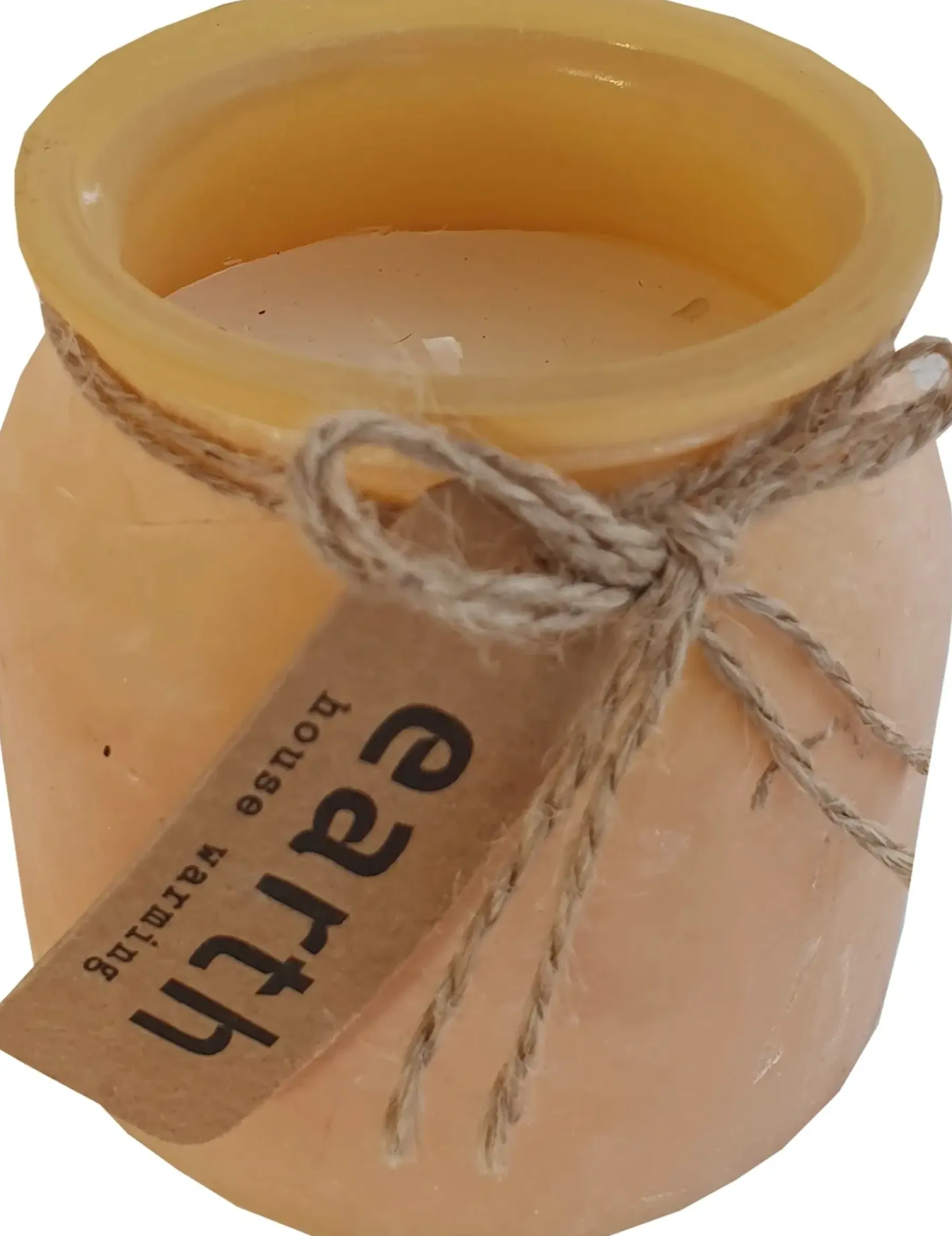 Keltainen huurrepintainen lasi, jossa valkoinen kynttilä