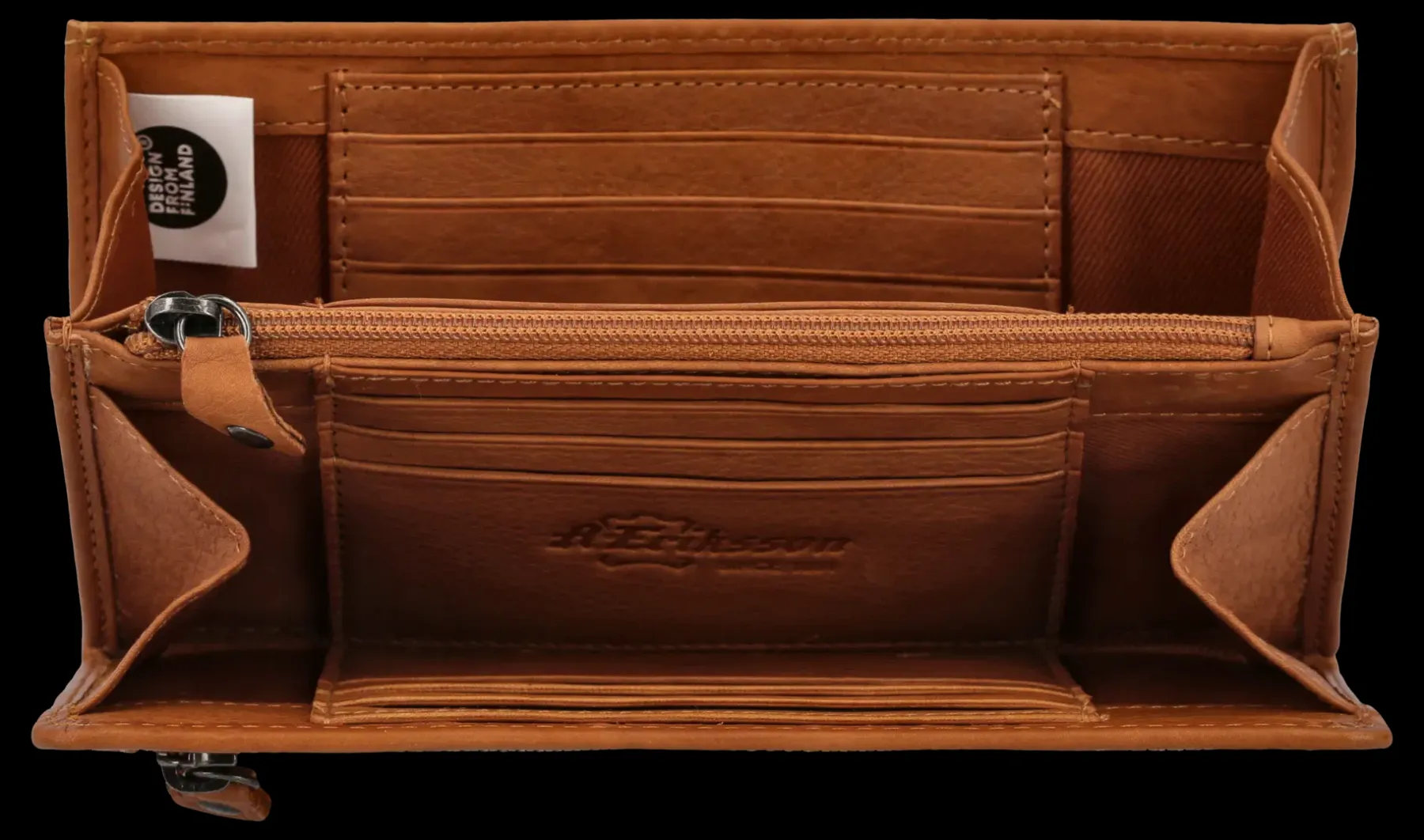 Näyttävä pehmeä nahkainen ja tilava lompakko. Nepparilla avattavan kannen alla kaksi tilavaa lokeroa joissa molemmin puolin aina 4 korttitaskua, yhteensä 16 paikkaa korteille. Lisäksi lompakon sisällä kaksi kapeaa vetoketjullista taskua ja ulkopuolella takana hieman tilavampi kolikoille. Tuotteessa oleva RFID suojaus estää korttien sirun luvattoman luennan lompakon läpi.