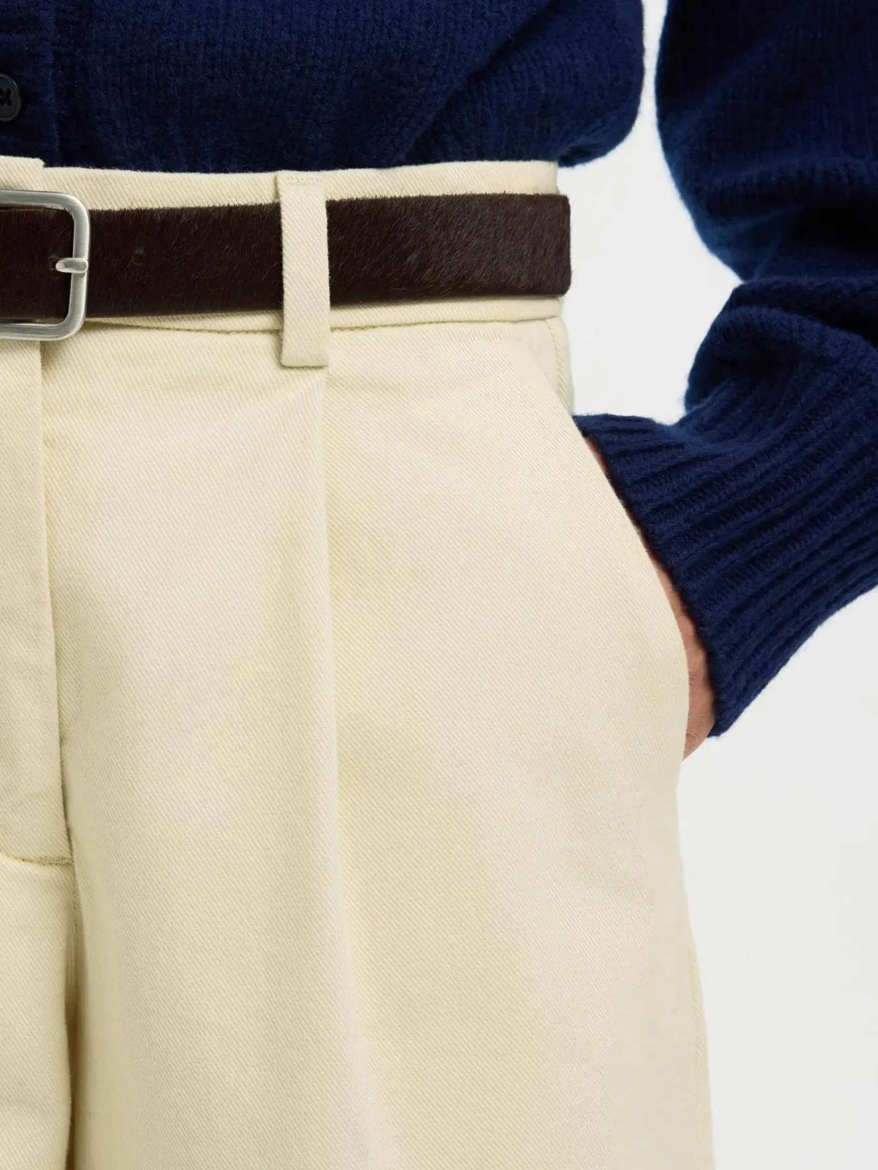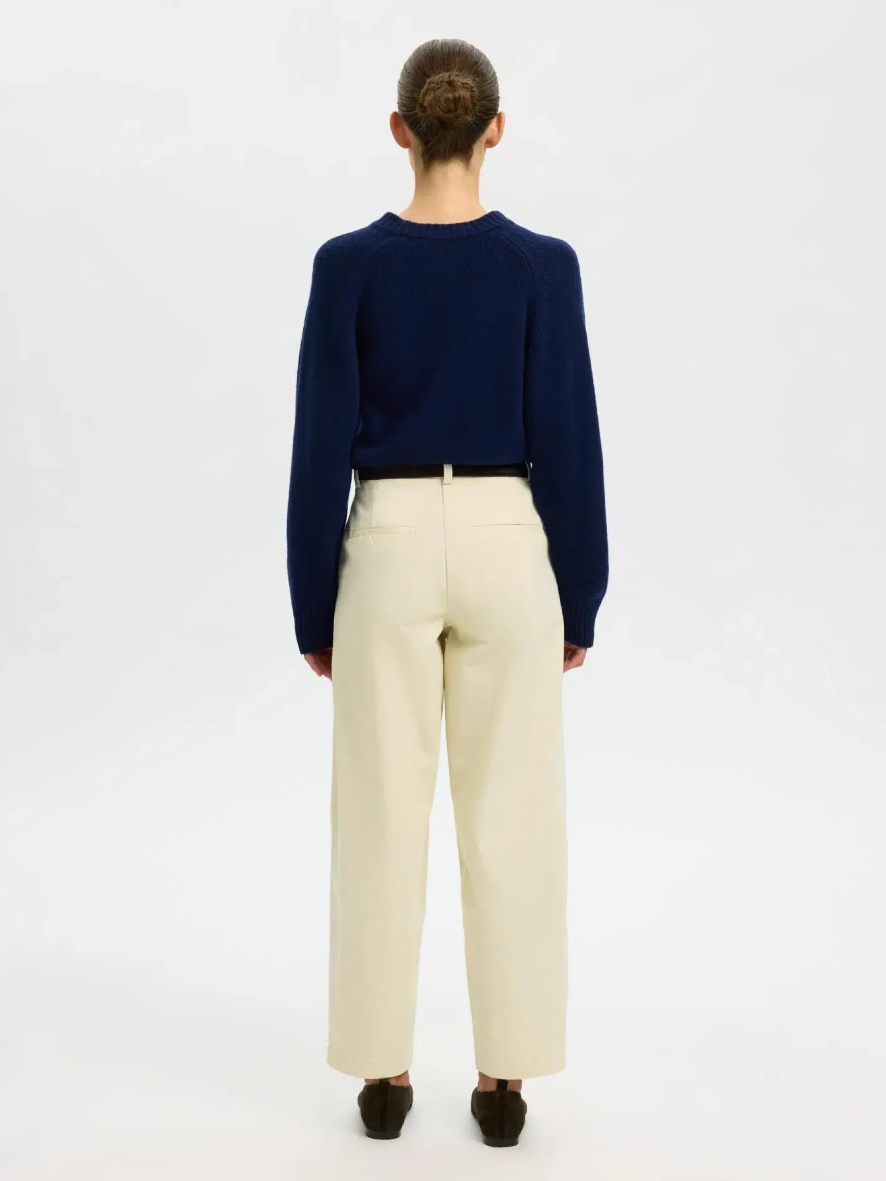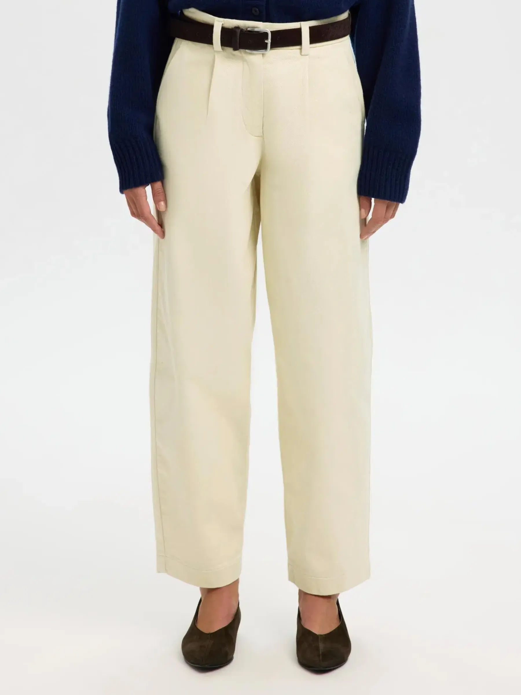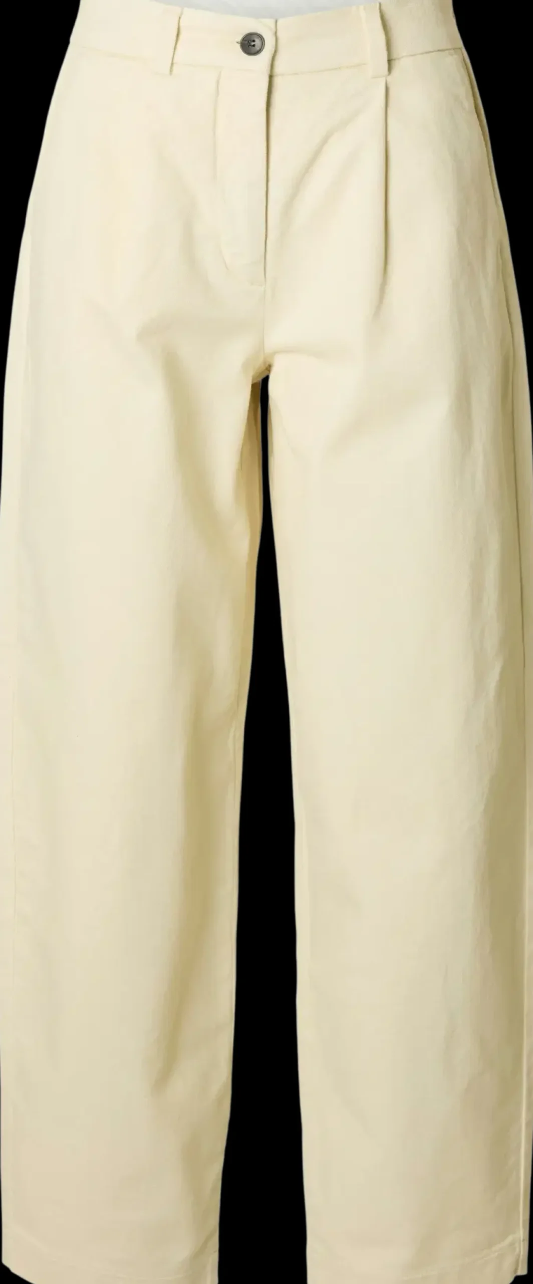 Normaalivyötäröiset farkut nappikiinnityksellä ja barrel-lahkeilla.