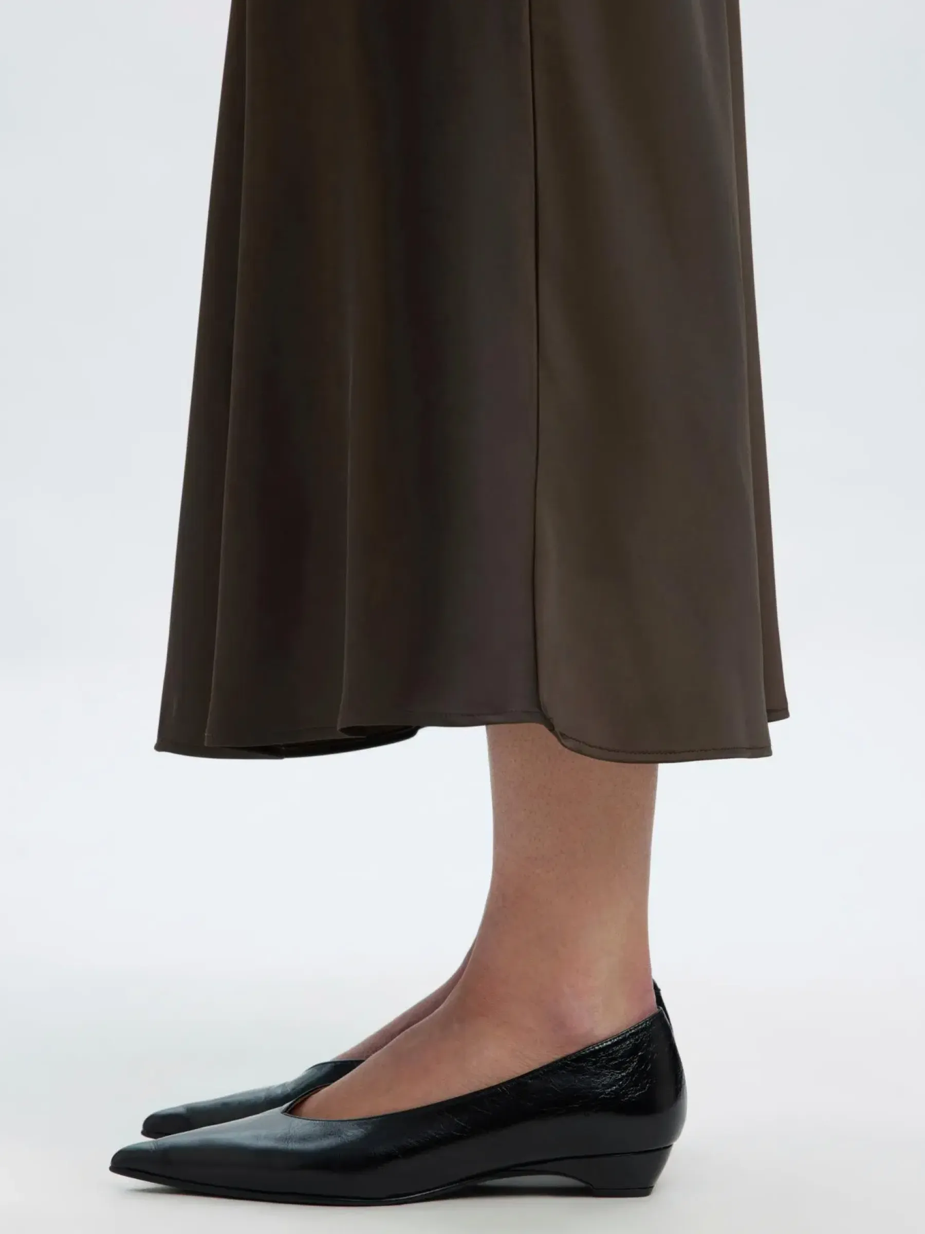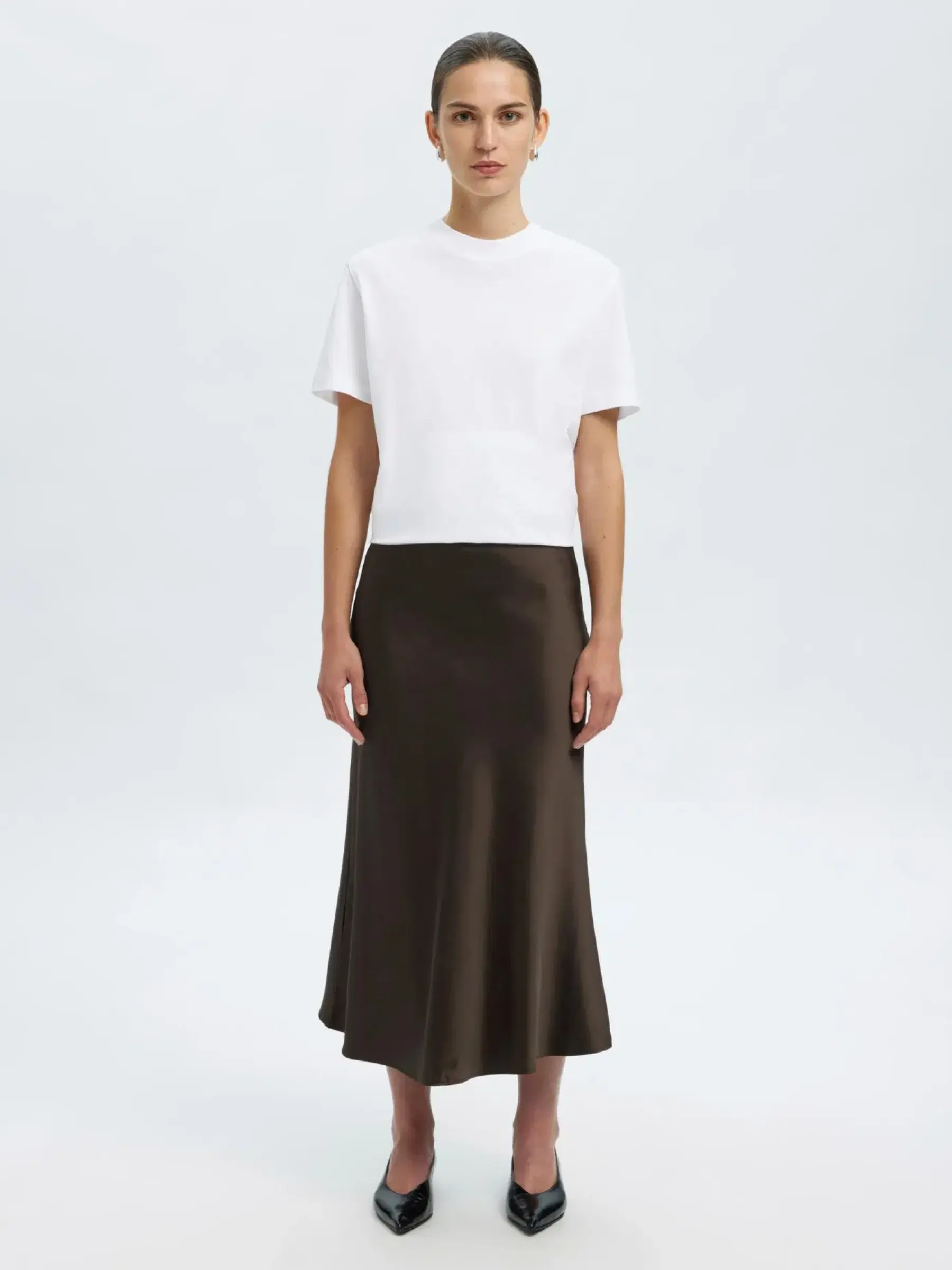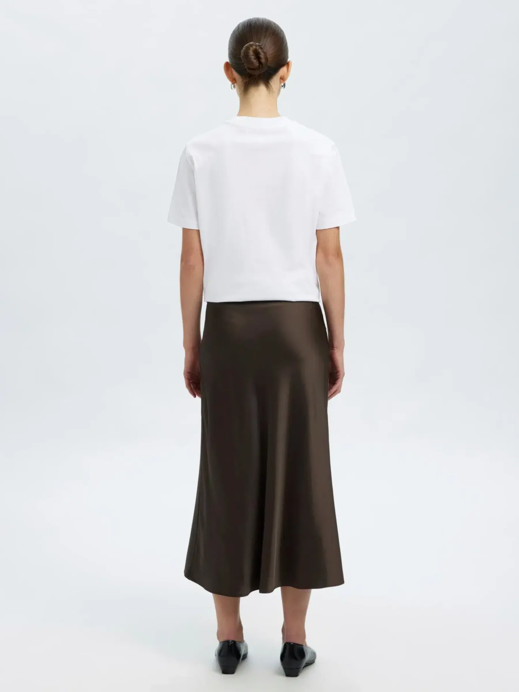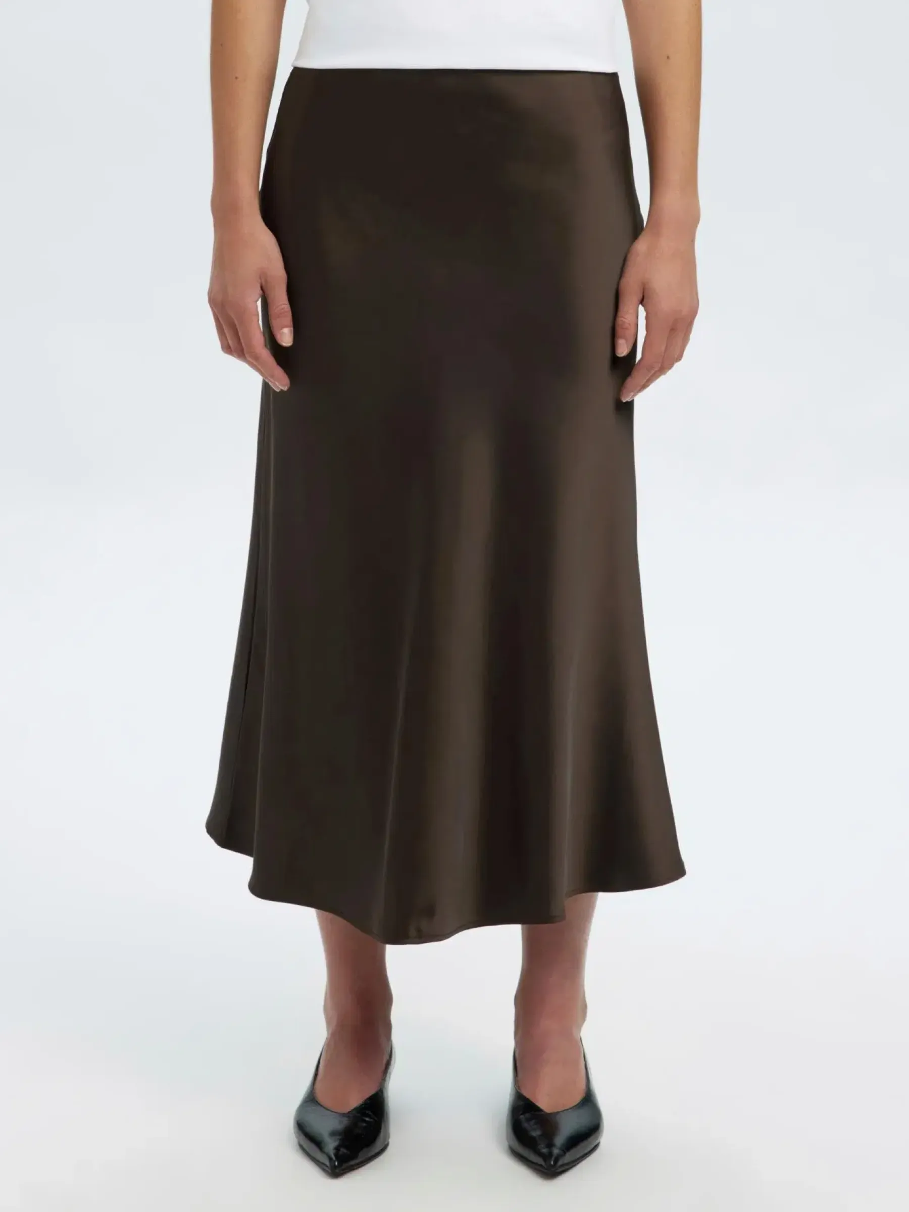 Kaunis midimittainen satiinihame korkealla vyötäröllä.