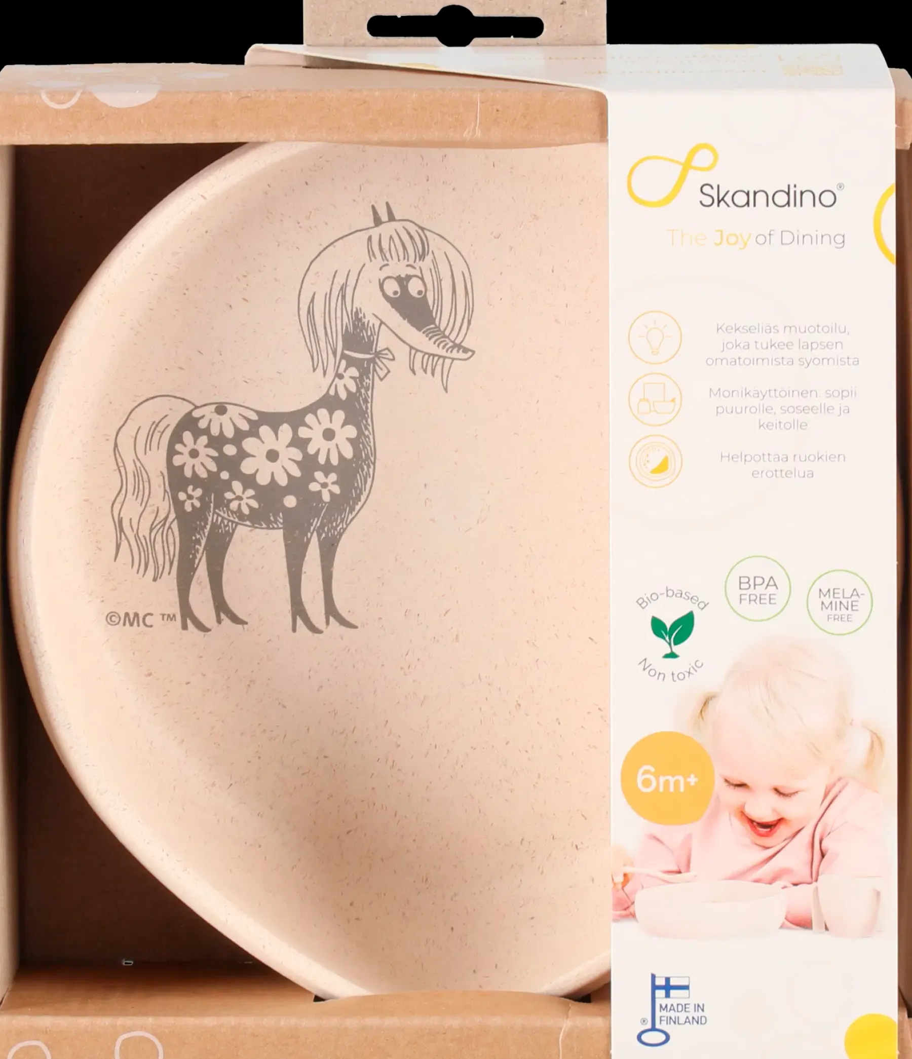Ergonominen muotoilu auttaa lasta oppimaan itsenäisen ruokailun taitoja turvallisesti. Lapsi saa tärkeitä ja iloisia oppimisen kokemuksia, kiitos innovatiivisen muotoilun! Lautasta ympäröivä kouru auttaa pitämään ruoan lautasella. Kaltevan pohjan ansiosta ruoka valuu lautasen kulmaan, josta se on helppo poimia lusikkaan. Syömisen ilo kannustaa lasta syömään yhä itsenäisemmin, mikä edistää ruokailutaitojen kehittymistä. Lautanen on suunniteltu yhdessä puheterapeuttien ja toimintaterapeuttien kanssa.Tuotteet on valmistettu biomateriaalista, joka on akkreditoiduissa laboratorioissa vahvistettu 100% myrkyttömäksi. Mikron ja konepesun kestävä. Skandinon tuotteet on rakkaudella muotoiltu ja valmistettu Suomessa.