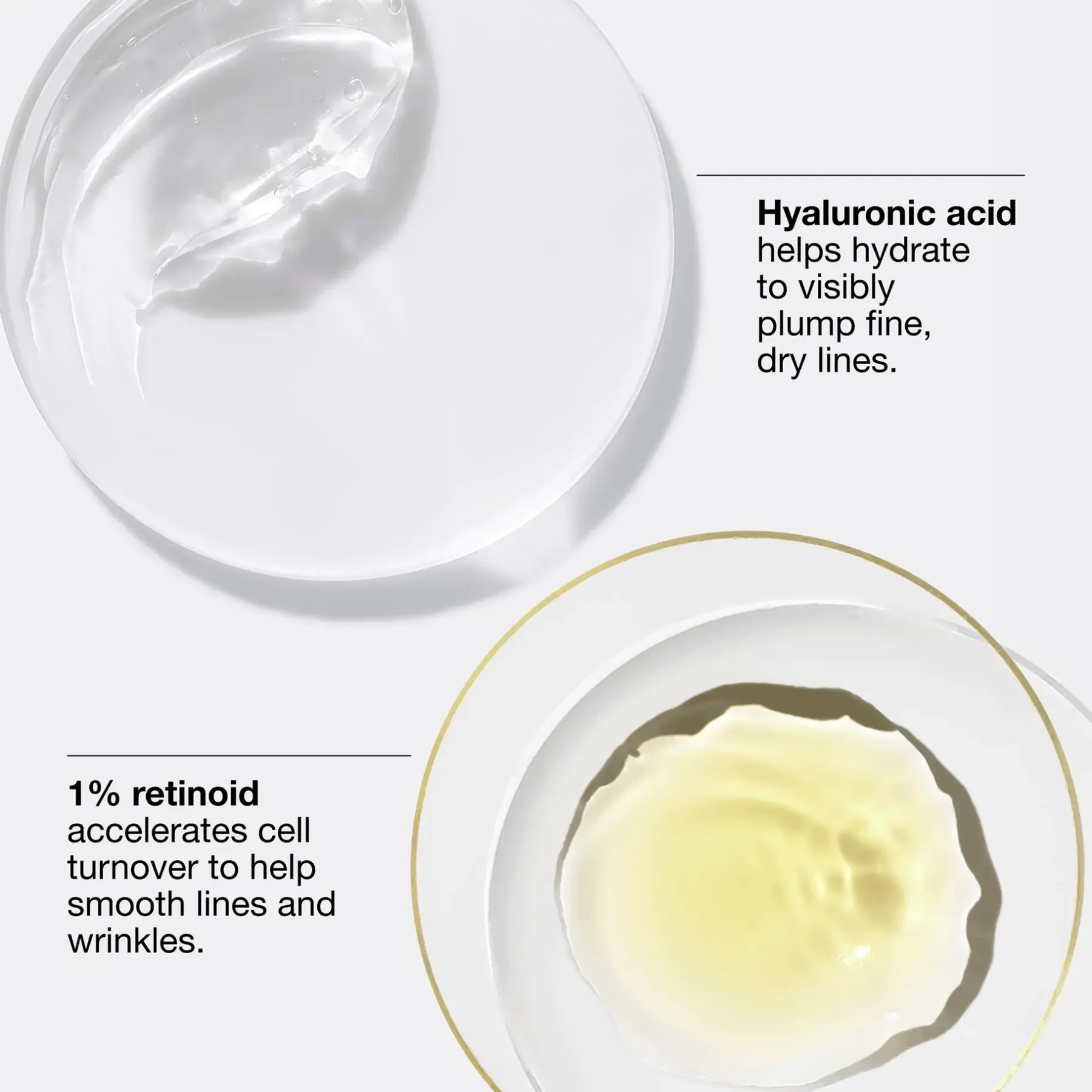 Koostumus sisältää 1 % edistynyttä retinoidia, joka auttaa nopeuttamaan ihon luonnollista solujen uusiutumisprosessia häivyttäen näkyvästi ryppyjä. Hyaluronihappo tarjoaa rauhoittavaa kosteutusta auttaen tasoittamaan hienoja, kuivia juonteita.