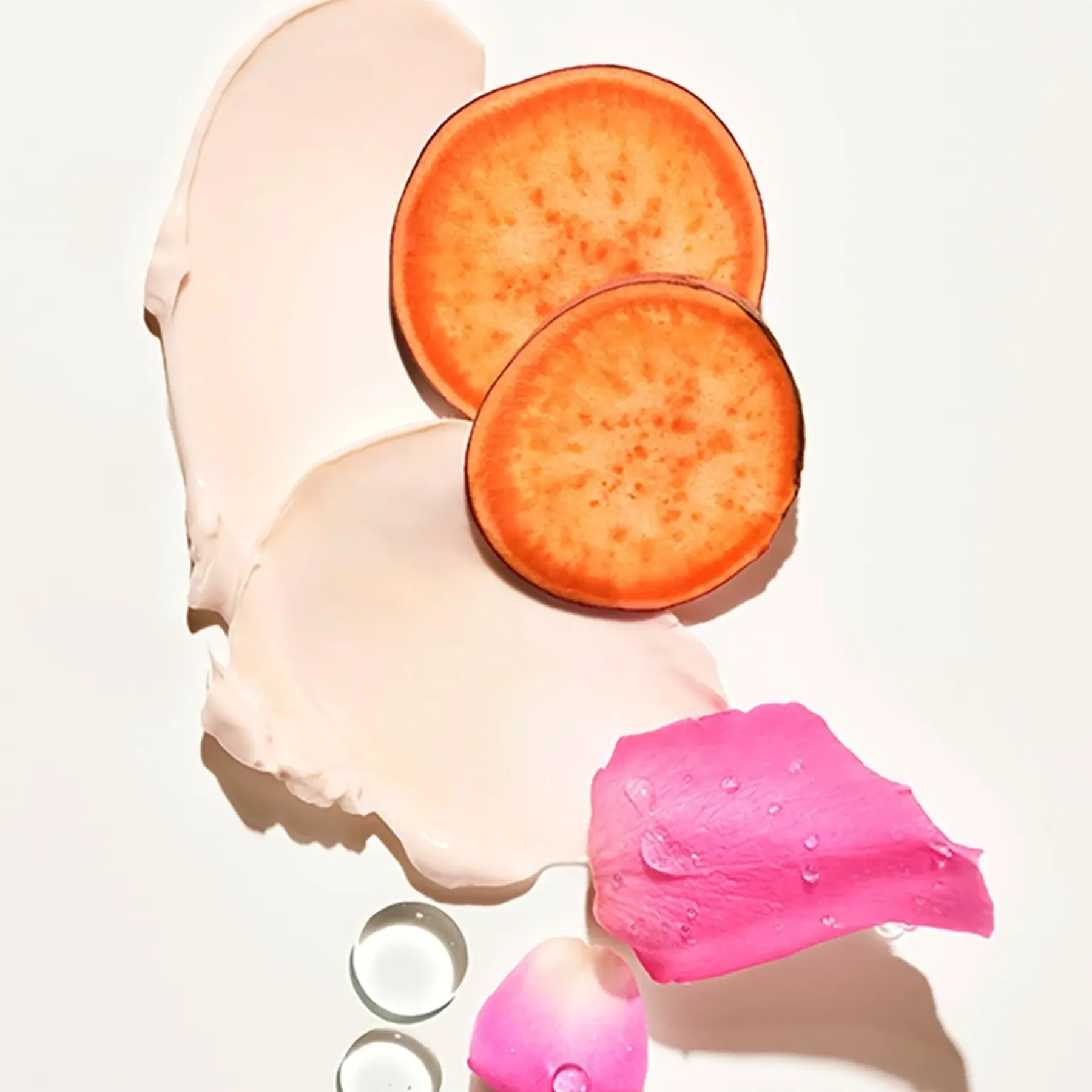 Aqua (Water, Eau), Glycerin, Dicaprylyl Carbonate, Diphenylsiloxy Phenyl Trimethicone, Propanediol, Parfum (Fragrance), Propylene Glycol Dibenzoate, C14-22 Alcohols, Cetearyl Alcohol, Dimethicone, Betaine, Palmitoyl, Tetrapeptide-10, Polymnia Sonchlfolia (Brazilian Yacón) Root Juice, Rosa Damascena Flower Water, Butyrospermum Parkii (Shea) Butter, Astrocaryum Murumuru Seed Butter, Theobroma Grandiflorum (Cupuaçu) Seed Butter, Mangifera Indica (Mango) Seed Butter, Myrciaria Dubia (Camu Camu) Fruit Extract, Bis-Diglyceryl Polyacyladipate-2. Cetearyl Olivate, Caprylyl Glycol, Caprylic/Capric Triglyceride, Cetyl Palmitate, Butylene Glycol, Hydrogenated Lecithin, Sorbitan Stearate, C12-20 Alkyl Glucoside, Sorbitan Olivate, Polysorbate B0, 1,2-Hexanediol, Hydroxyethyl Acrylate/Sodium Acryloyldimethyl Taurate Copolymer, Acrylates/C10-30 Alkyl Acrylate Crosspolymer, Xanthan Gum, sodium Phytate, Citric Acid, Tromethamine, Sodium Benzoate, Potassium Sorbate, Hydroxy acetophenone, Tocopherol, Citronellol, Limonene, Linalool, LinalyI Acetate, Pinene,Rose Ketones, Tetramethyl Acetyloctahydronaphthalenes, Trimethylcydo- pentenyl Methylisopentenol, Caramel, CI 17200 (Red 33) CI 15985 (Yellow 6).