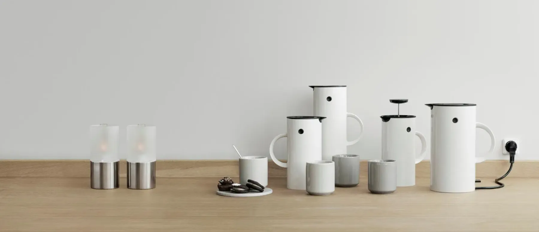Steltonin tyylikäs 0,5 litran valkoinen termoskannu EM77 vuodelta 1977 on todellinen aikakautensa design klassikko. Suunnittelija Erik Magnussen. Runkomateriali on terästä ja sisällä tuplaseinämä lasipullo vakuumilla, joka pitää juoman kuumana jopa 12 tuntia. Kahva ja kaato-osa ovat muovia. Korkeus 21 cm ja halkaisija 10,5 cm. Tuotteen helppokäyttöisyys perustuu oivalliseen ”kippaavaan” kaatokorkkiin, jota ei tarvitse avata kaadettaessa. Käytännöllisessä ja laadukkaassa termoskannussa on myös toinen täysin tiivis kierrekorkki esim. kuljetukseen ja pidempään kuumana pitämiseen. Termoskannu on pitkäikänen, sillä siihen saa kaikki osat varaosina. Valmistettu Tanskassa.
