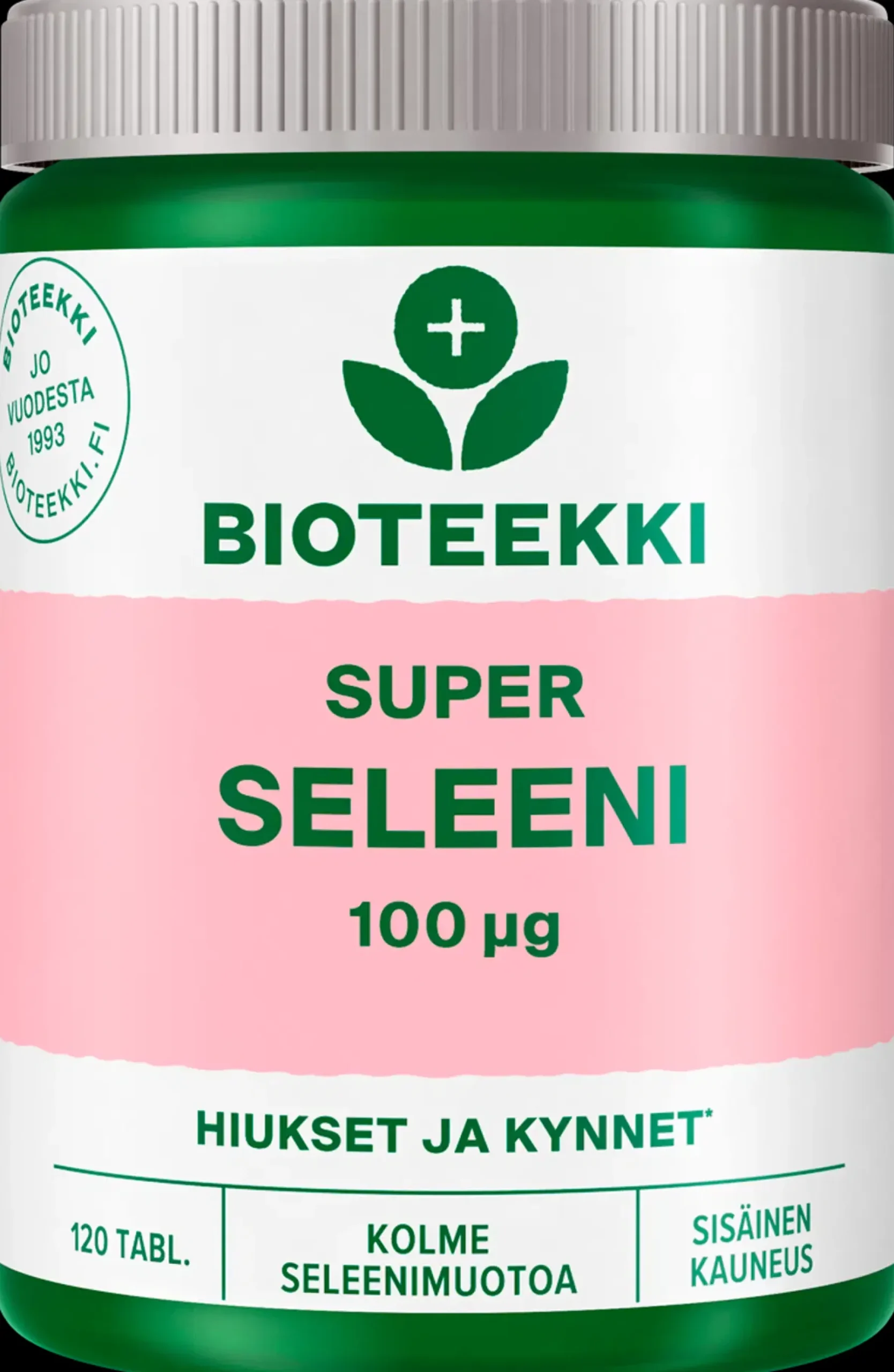 Bioteekki Super Seleeni on vahva ja hyvin imeytyvä seleenivalmiste, joka sisältää kolmea eri seleenimuotoa: seleenimetioniinia, seleenihiivaa ja natriumseleeniä. Jokaisella seleenimuodolla on oma tärkeä roolinsa elimistössä, ja optimaalisen seleenituen kannalta tärkeää, että valmisteessa on kaikkia seleenin kolmea muotoa. Super Seleenin monipuolinen kolmen seleenimuodon yhdistelmä helposti nieltävässä tabletissa takaa erinomaisen biologisen hyväksikäytettävyyden. Seleeni on tärkeä hivenaine vastustuskyvylle ja kilpirauhasen toiminnalle. Se on myös tärkeä hiusten ja kynsien hyvinvoinnille ja siittiöiden muodostumiselle. Lisäksi seleeni on antioksidantti, joka suojaa soluja hapettumisstressiltä. Tuote ei sisällä gluteenipitoisen viljan ainesosia eikä eläinperäisiä ainesosia. Laktoositon, maidoton ja liivatteeton. Sopii vegaaneille.