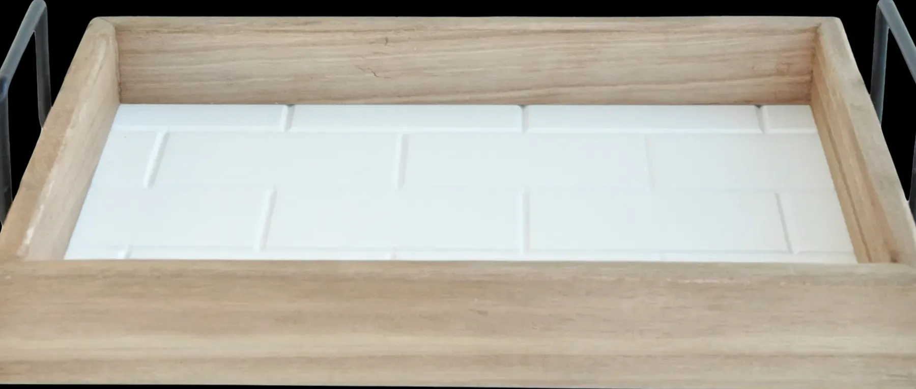 Puinen tarjotin, jossa metalliset mustat kantokahvat. Pohja on valkoista tiilikuviota ja reunukset vaaleaa puuta.