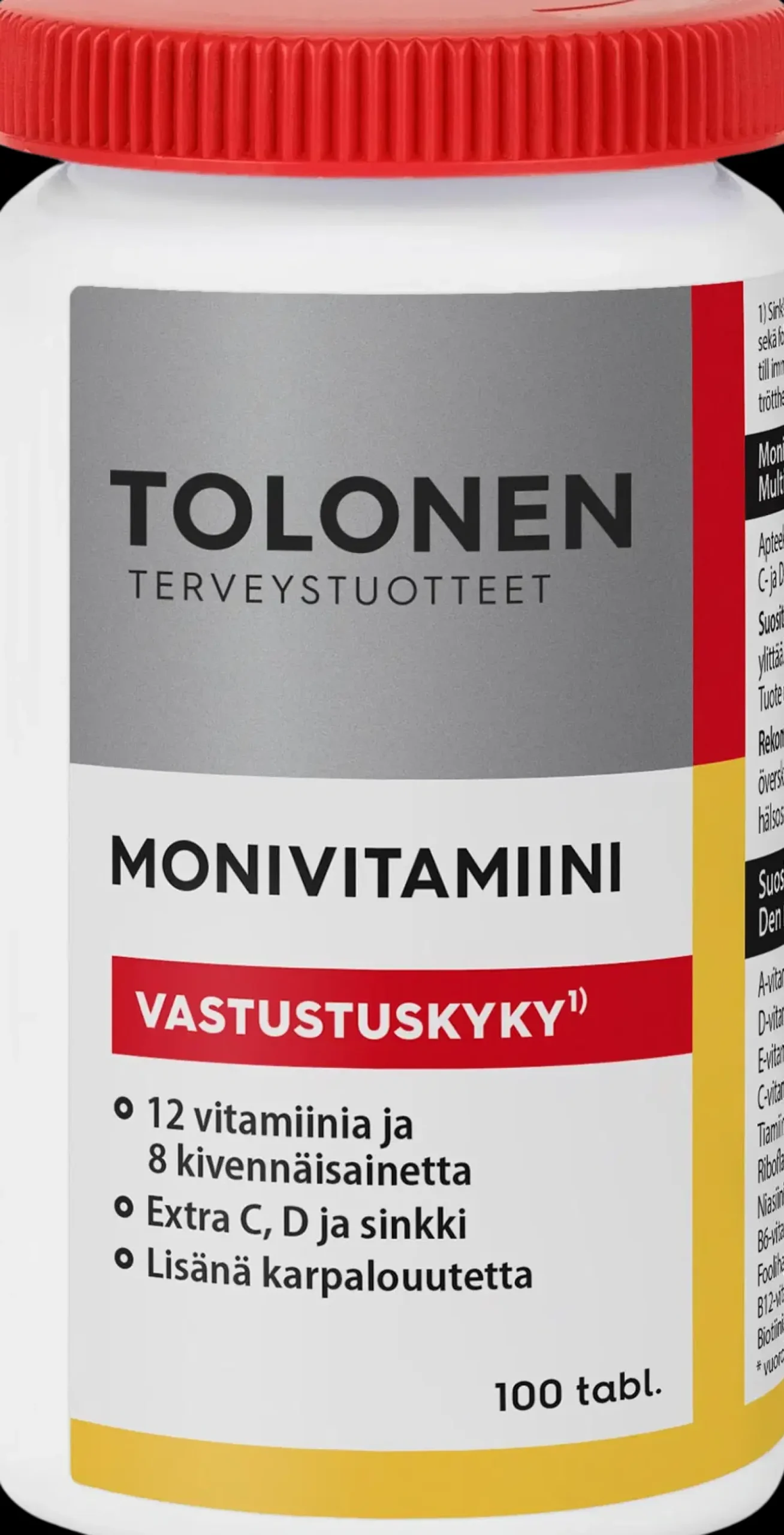 Tolonen Monivitamiini Vastustuskyky, sisältää 12 vitamiinia ja 8 kivennäisainetta päivittäiseen hyvinvointiin. Extra-annos C-, ja D-vitamiinia sekä sinkkiä vastustuskyvylle. Lisänä 15 mg karpalouutetta. Sinkki, D- ja C-vitamiini edistävät immuunijärjestelmän normaalia toimintaa. C-, B6- ja B12-vitamiinit sekä folaatti ja rauta auttavat vähentämään väsymystä ja uupumusta. Suositeltava vuorokausiannos aikuisille: 1 tabletti. Ilmoitettua suositeltua vuorokausiannosta ei saa ylittää. Ravintolisä ei korvaa monipuolista ja tasapainoista ruokavaliota eikä terveitä elämäntapoja. Tuote on säilytettävä pienten lasten ulottumattomissa. Ei laktoosia/gluteenia/soijaa/hiivaa. Kehitetty Suomessa, valmistettu Ruotsissa! Apteekkitason koostumus. Lajitteluohje: Muovijäte.
