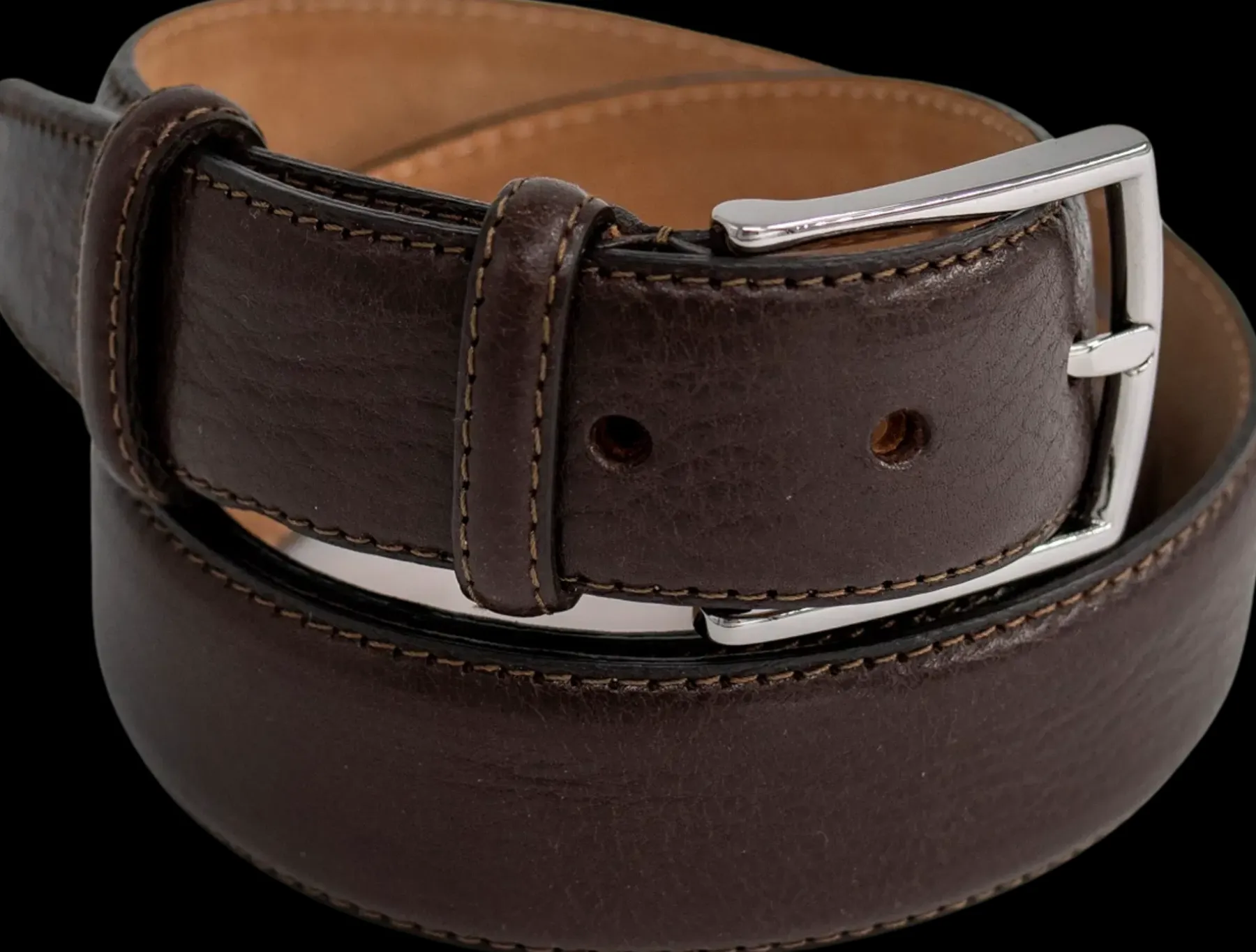Forlìssa, Italiassa valmistettu laadukas nahkainen tummanruskea vyö. Sisäpuoli vaaleaa erikoishienoa nupukkinahkaa. Hopeansävyinen metallisolki, leveys 3,5 cm.
