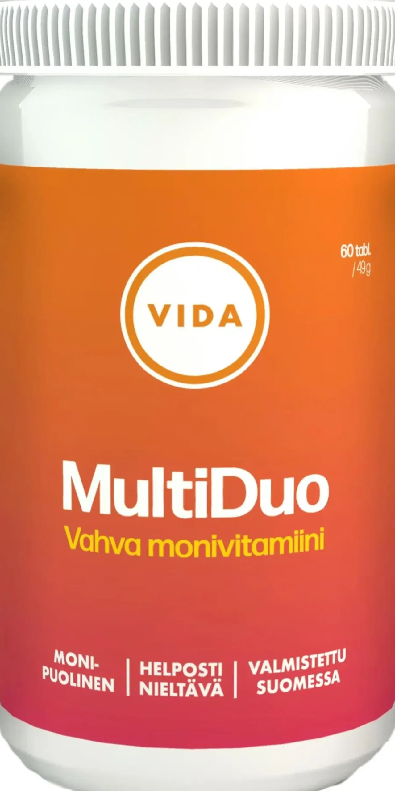 Kotimainen Vahva Vida MultiDuo on tarkoitettu kaikkien tärkeiden vitamiinien ja mineraalien saannin varmistamiseksi. Pitoisuuksiltaan vahva Vida MultiDuo sisältää kaikki tärkeät 19 eri vitamiinia ja hivenainetta yhdessä helposti nieltävässä tabletissa. Monipuolinen Vida MultiDuo edistää immuunijärjestelmän normaalia toimintaa.