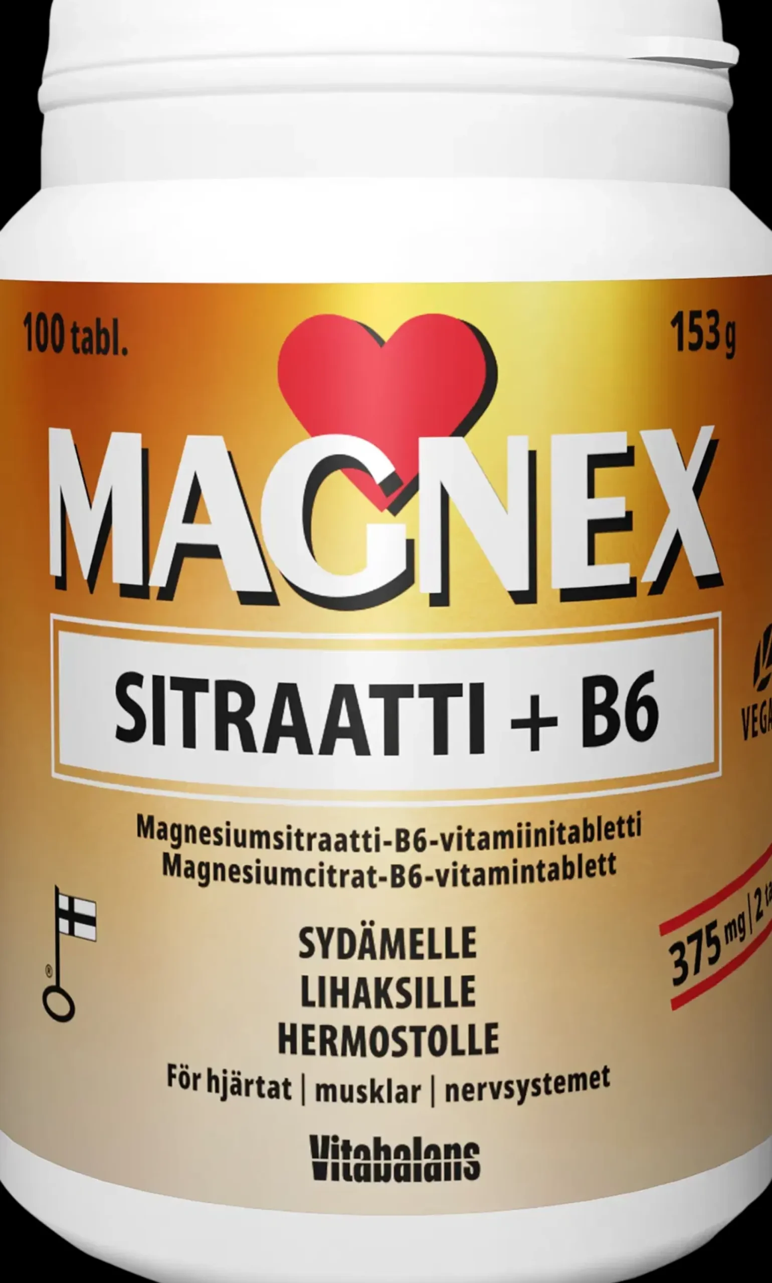 – Suomessa valmistettu Magnesiumsitraatti -valmiste. Suositeltava vuorokausiannos aikuisille 2 tablettia päivässä. Magnesium edistää hermoston ja lihasten normaalia toimintaa. Suositeltua vuorokausiannosta ei saa ylittää. Ravintolisä ei korvaa monipuolista ja tasapainoista ruokavaliota eikä terveitä elämäntapoja. Sokeriton