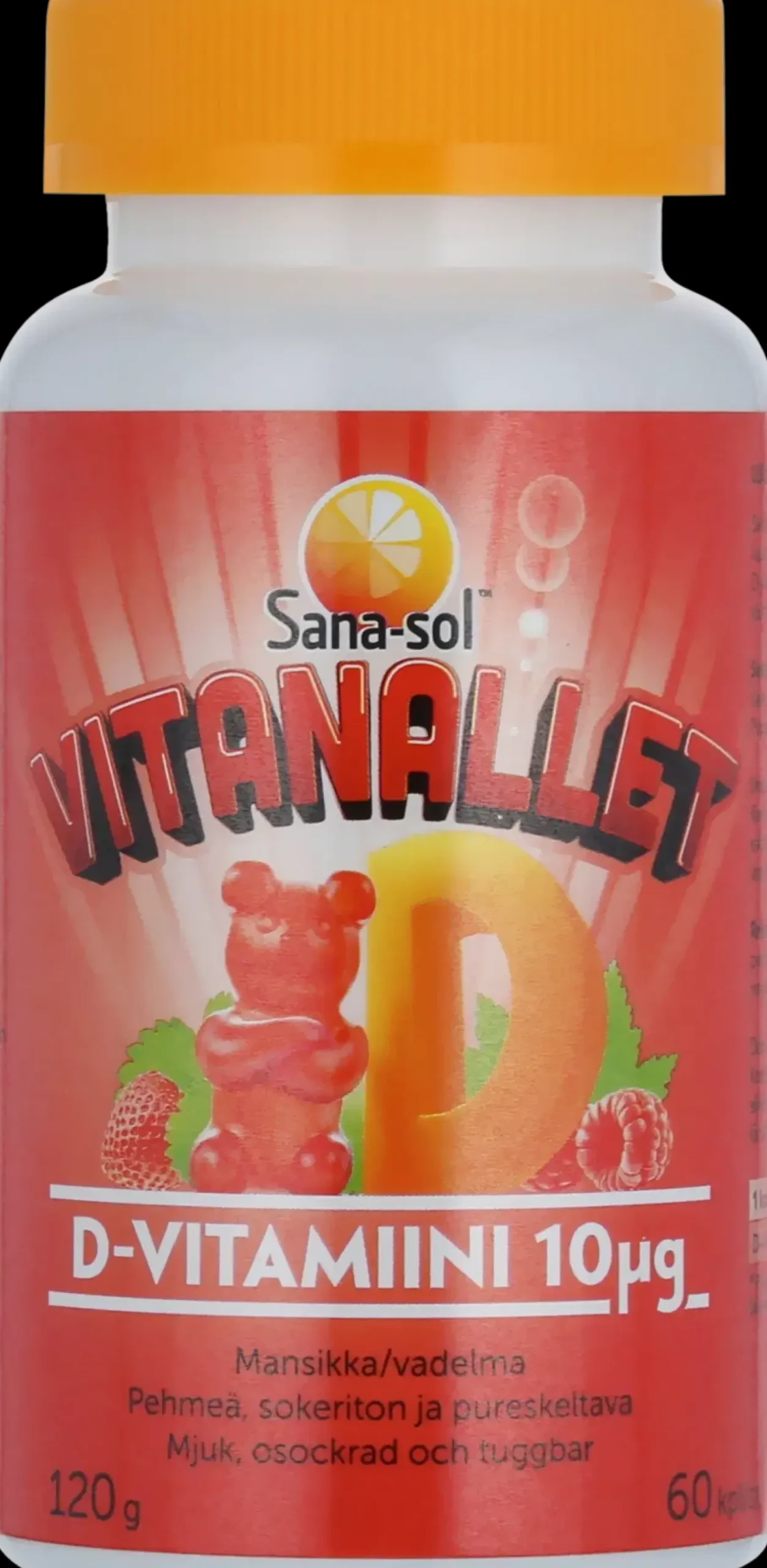 Sana-sol Vitanallet D-vitamiini on hyvänmakuinen, päivittäiseen käyttöön soveltuva D-vitamiinilisä pehmeässä ja pureskeltavassa muodossa koko perheelle 3-vuotiaasta alkaen. Päiväannoksessa (1 kpl) on 10 µg D-vitamiinia. Vitanallet ovat mansikan-/vadelmanmakuisia. Sokeriton. D-vitamiini toimii luuston hyväksi, sillä se edistää kalsiumin imeytymistä. D-vitamiini edistää immuunijärjestelmän ja lihasten normaalia toimintaa. Sitä tarvitaan myös solujen jakautumiseen. Ravintolisä ei korvaa monipuolista ja tasapainoista ruokavaliota eikä terveitä elämäntapoja.