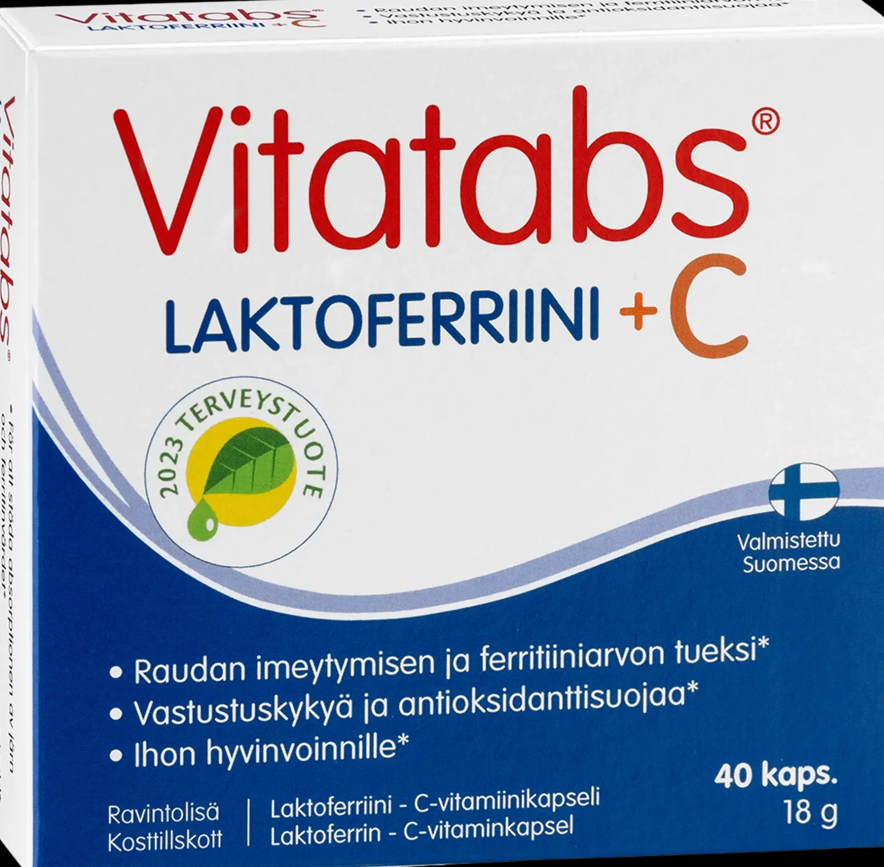 Laktoferriini on maidon luonnollinen ainesosa, joka edistää raudan biologista hyväksikäytettävyyttä sitomalla rautaa itseensä jo suolistossa. Laktoferriini säätelee solunsisäistä rautatasapainoa edistämällä raudan siirtymistä solujen varastoista verenkiertoon ja ehkäisten ylimääräisen raudan kertymistä soluihin. Laktoferriini vahvistaa kehon luontaisia puolustusmekanismeja ja edistää myös ihon hyvinvointia. C-vitamiini lisää raudan imeytymistä, edistää immuunijärjestelmän normaalia toimintaa ja solujen suojaamista hapettumisstressiltä sekä auttaa vähentämään väsymystä ja uupumusta. Valmistettu Suomessa.