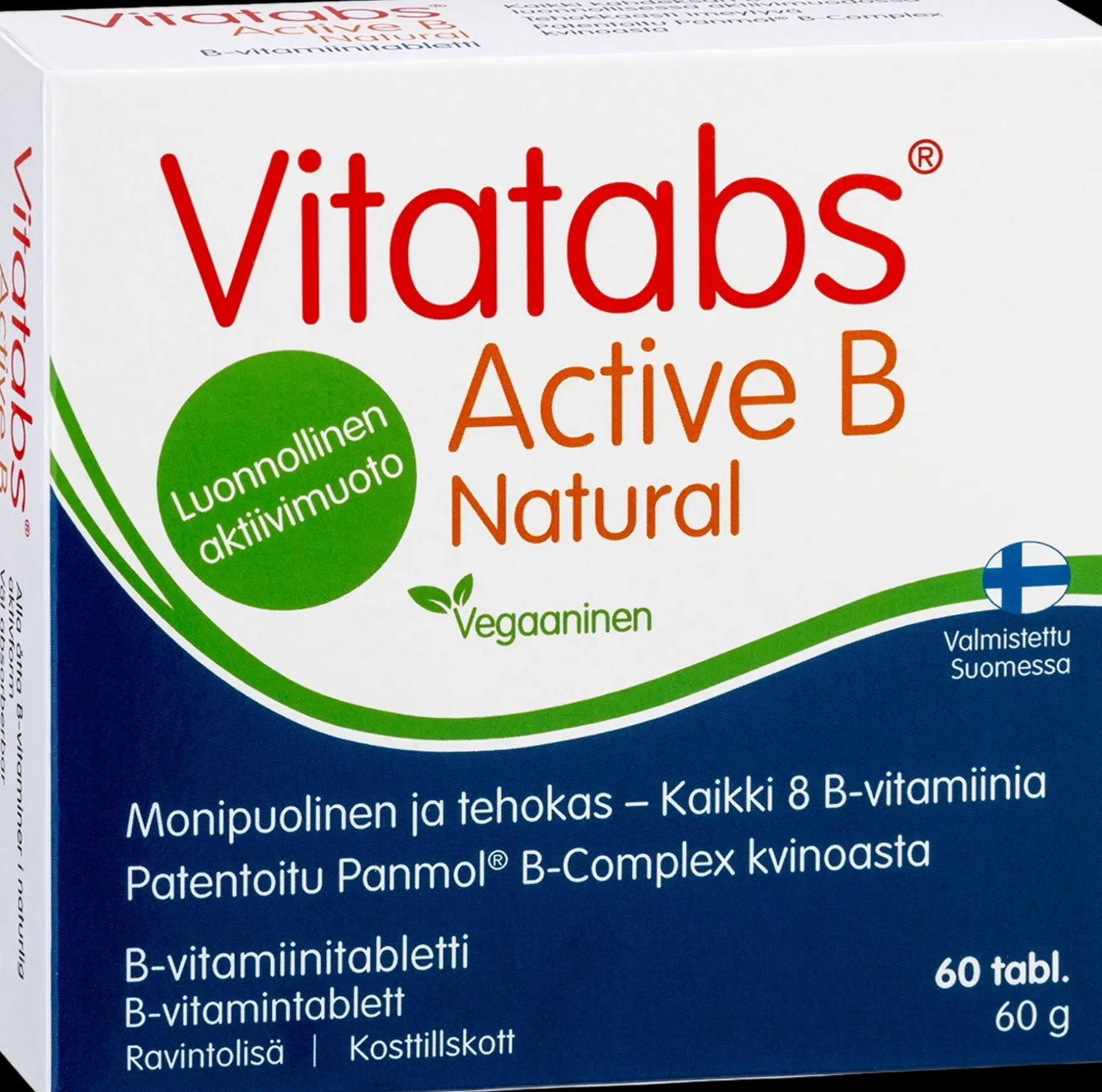 Vitatabs® Active B sisältää korkealuokkaista luomukvinoasta valmistettua Panmol® B-Complex kvinoanversojauhetta, jossa kaikki kahdeksan B-vitamiinia ovat luonnollisessa orgaanisessa aktiivimuodossa koentsyymeihin sitoutuneina. Patentoidun koostumuksen ja valmistusmenetelmän ansiosta Panmol® B-Complexin sisältämät B-vitamiinit imeytyvät elimistön hyödyksi tehokkaasti. Vesiliukoisia B-vitamiineja tarvitaan päivittäin kehon normaalin toiminnan ylläpitämiseen. Niiden tarvetta lisäävät mm. fyysinen rasitus, ravinnon imeytymishäiriöt, yksipuolinen ravinto ja runsas alkoholinkäyttö. Vitatabs® Active B -valmisteesta saat luonnollisessa ja tehokkaasti imeytyvässä muodossa kaikkia kahdeksaa B-ryhmän vitamiinia aineenvaihdunnan, ihon ja hermoston hyväksi sekä vähentämään väsymystä ja uupumusta. Annostus: 1-2 tablettia päivässä. Tuote sopii jatkuvaan käyttöön. Laktoositon, hiivaton, makeuttamaton ja gluteeniton. Ei sisällä eläinperäisiä ainesosia.Valmistettu Suomessa.