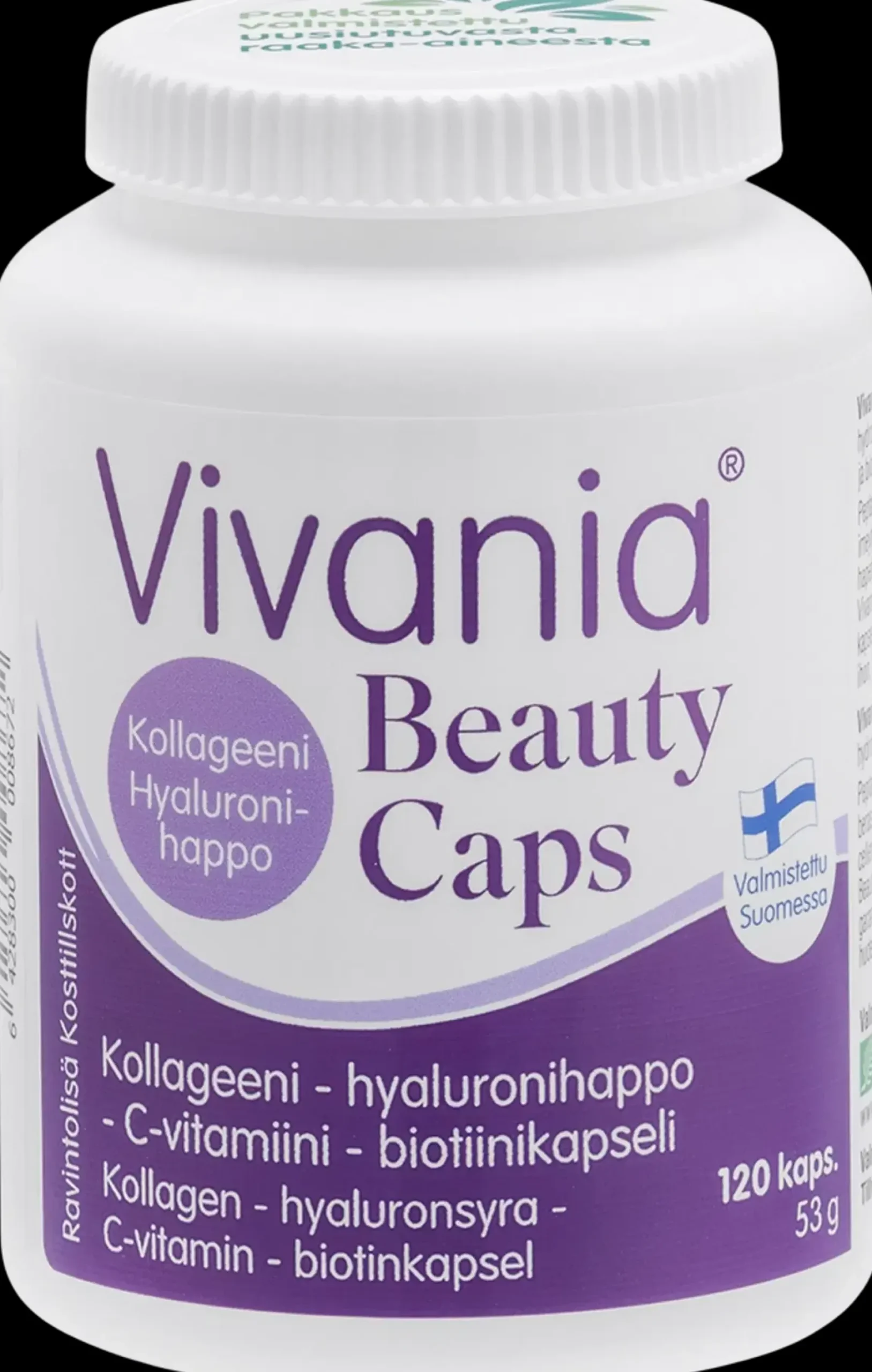 Vivania® Beauty Caps sisältää monipuolisen yhdistelmän 1. tyypin hydrolysoitua Peptan® B kollageenia, hyaluronihappoa, C-vitamiinia ja biotiinia. Peptan® B kollageeni on pienimolekyylistä, mikä takaa sen erinomaisen imeytyvyyden. C-vitamiini edistää ihon hyvinvointia ja suojaa soluja hapettumisstressiltä sekä osallistuu kollageenin muodostumiseen. Vivania® Beauty Caps sisältää korkealaatuista hyaluronihappoa mikrokapseloituna, mikä takaa sen tehokkaan imeytymisen. Biotiini edistää ihon, hiusten ja limakalvojen pysymistä normaalina.