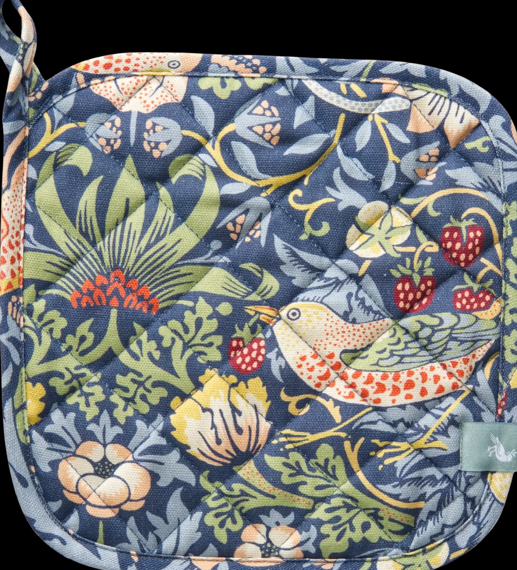 Pannulappu upeassa William Morris Strawberry Thief kuosissa, tekstiili on Öko-text hyväksytty. Materiaali 100% puuvillaa, täyte 70% puuvillaa ja 30% polyesteria. William Morris patakintaat ja -laput on testattu kosketuslämmön osalta ja täyttävät kontaktikuumuuden luokan 2 vaatimukset.