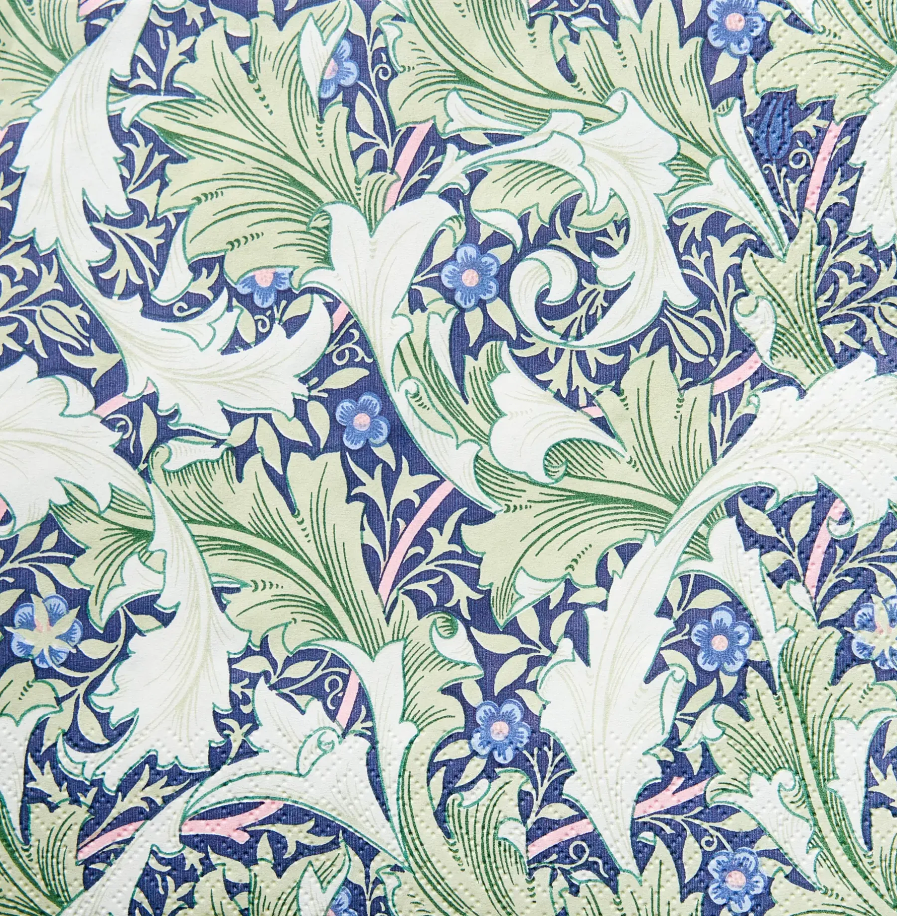 Upeat brittiläisen suunnittelijan William Morrisin vihreän ja sinisen sävyiset Granville lautasliinat. Kotimaiset lautasliinat ovat Havin valmistamat ja ne ovat painettu Imatralla 3-kertaiselle pehmopaperille. Lautasliinoille on myönnetty Avainlippu ja Joutsenmerkki.