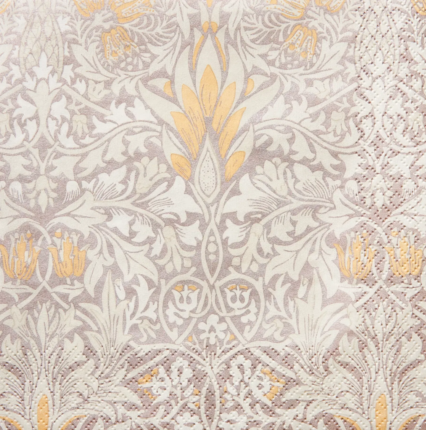 Upeat brittiläisen suunnittelijan William Morrisin platinan väriset Snakeshead lautasliinat. Kotimaiset lautasliinat ovat Havin valmistamat ja ne ovat painettu Imatralla 3-kertaiselle pehmopaperille. Lautasliinoille on myönnetty Avainlippu ja Joutsenmerkki.
