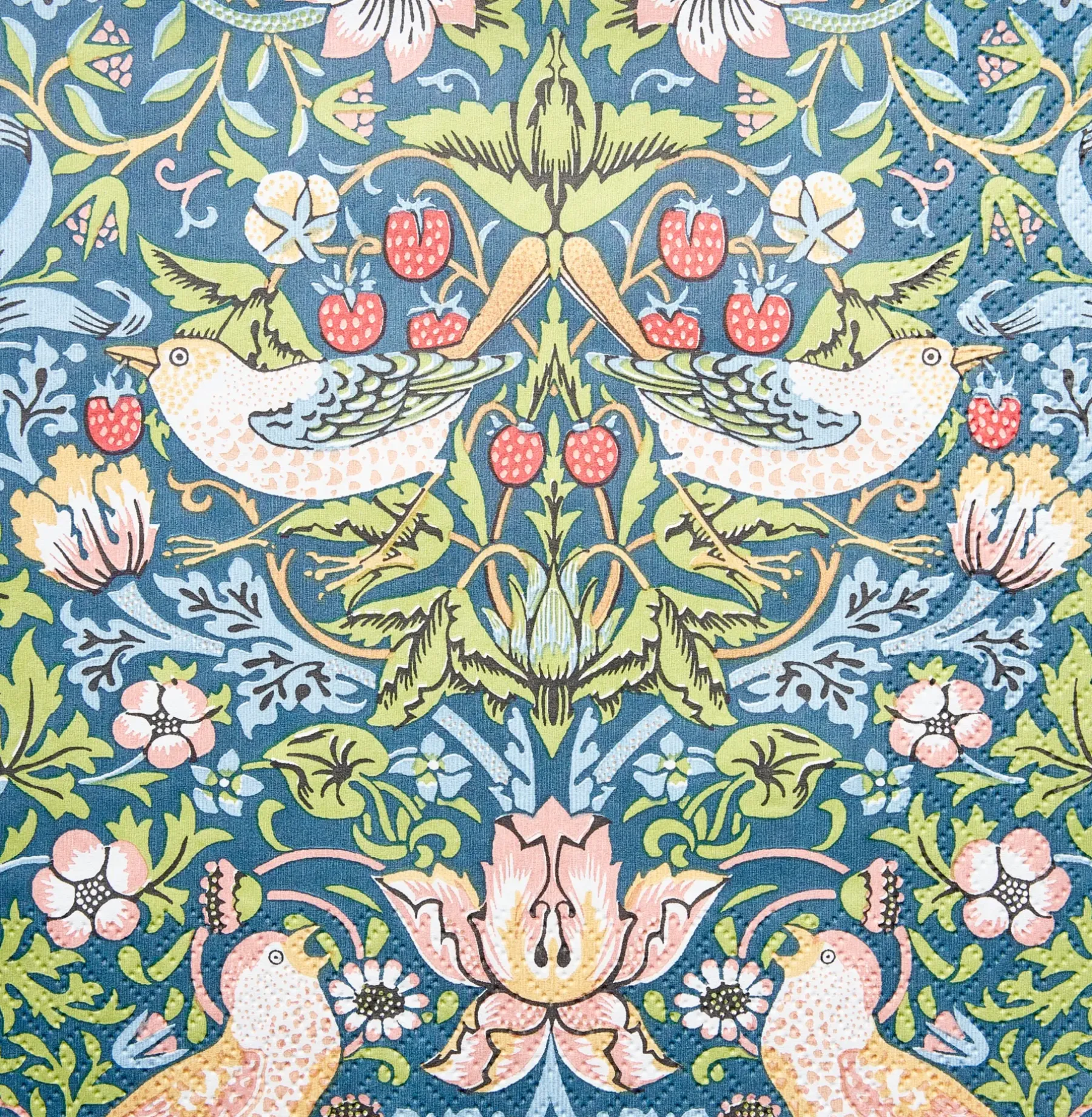 Upeat brittiläisen suunnittelijan William Morrisin sinisen sävyiset Strawberry Thief lautasliinat. Kotimaiset lautasliinat ovat Havin valmistamat ja ne ovat painettu Imatralla 3-kertaiselle pehmopaperille. Lautasliinoille on myönnetty Avainlippu ja Joutsenmerkki.
