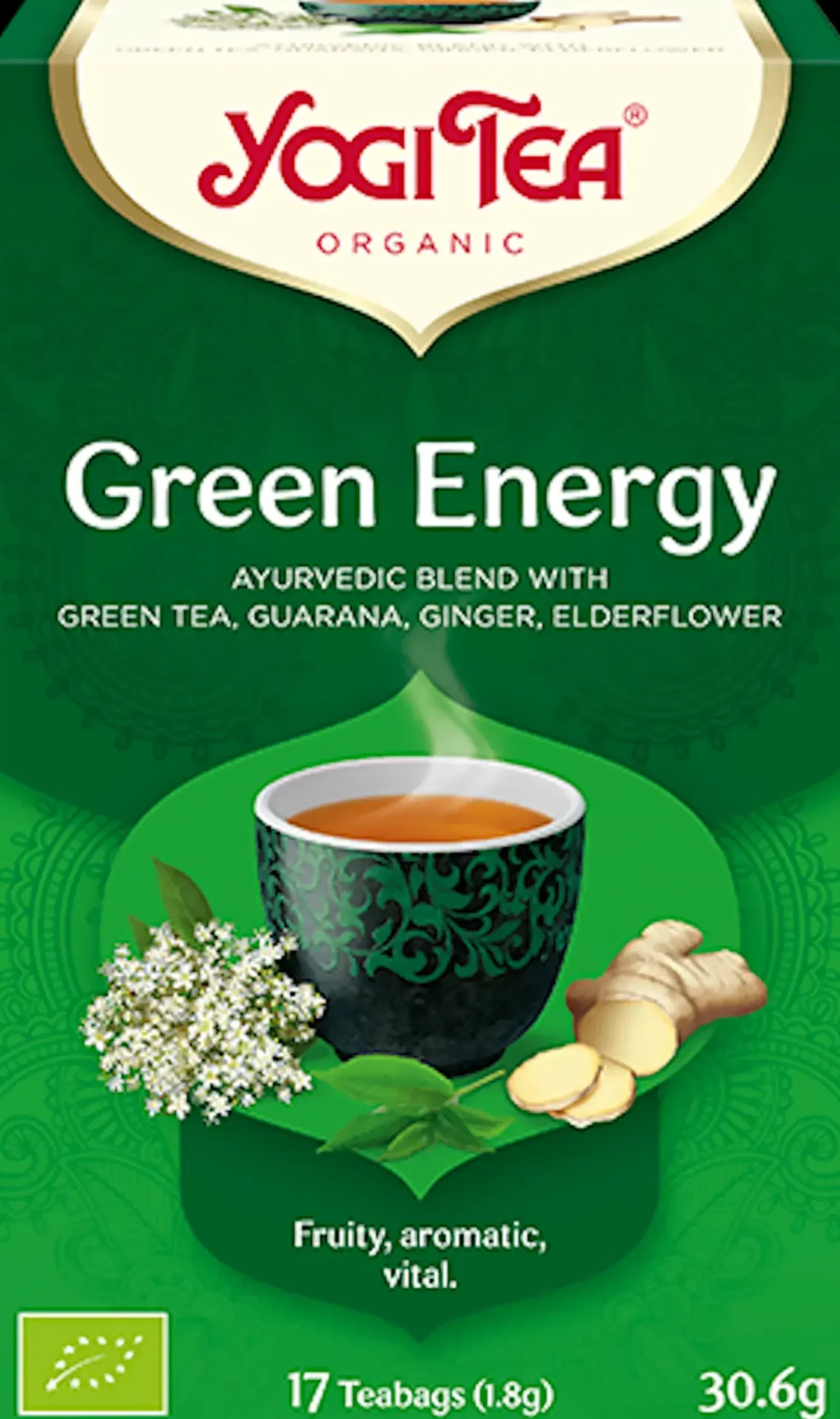 Vihreä tee* (68%), sitruunaruoho*, guarana* (7%), piparminttu*, inkivääri* (3%), seljankukka* (2%), mustapippuri*, luonnollinen aromi, kuivattu kombuchajuoma*, bergamottiöljy*, lippia*. *luomu. Sisältää inkivääriä – ei suositella raskaana oleville.