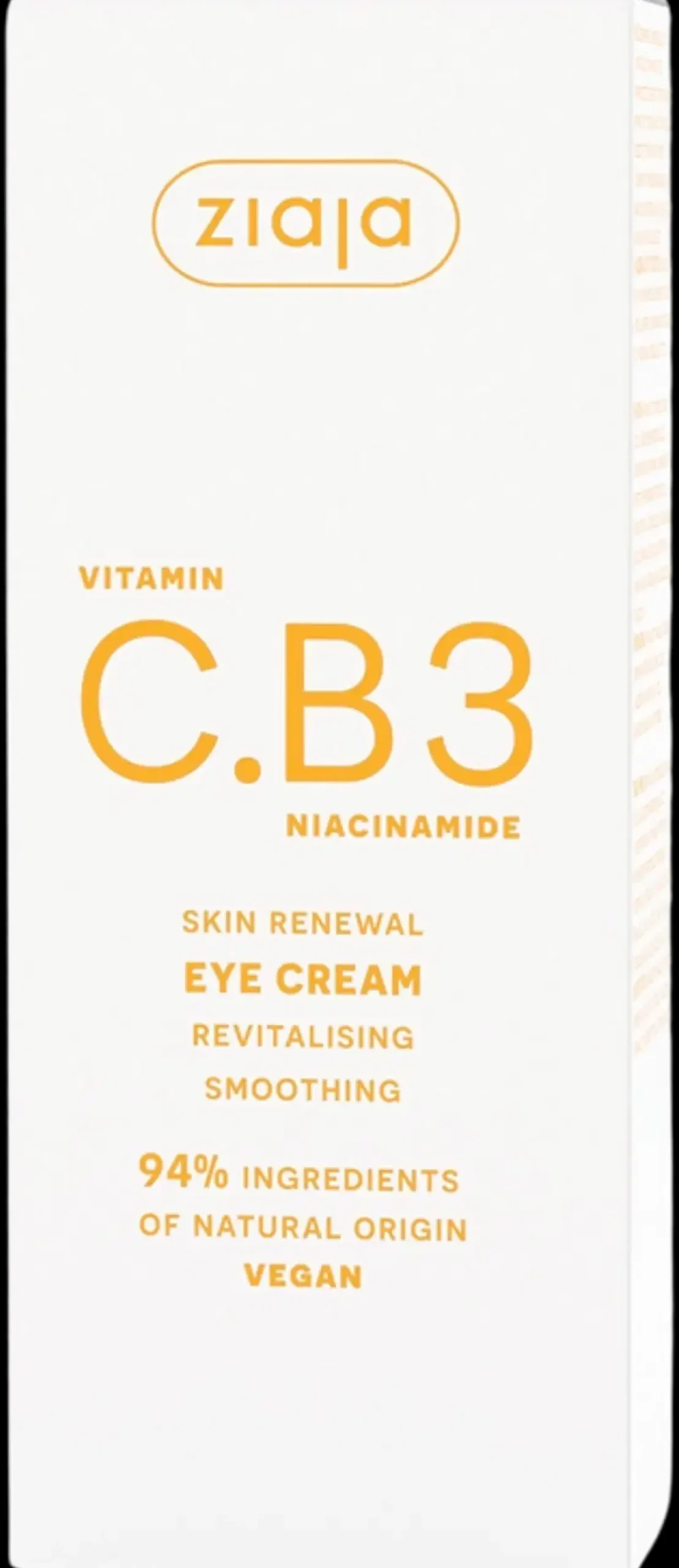 Ziaja C.B3-vitamiini silmänympärysvoide kaikille ihotyypeille. Sen sisältämät C-vitamiini ja niasiiniamidi (B3-vitamiini) silottavat ihoa ja parantavat sen sävyä antaen ihollesi kauniin hehkun. Häivyttää väsymyksen merkkejä ja juonteita. Luonnollisten peptidien yhdistelmä silottaa ihoa. Rauhoittavat B5- ja B6-vitamiinit tukevat ihon suojakerroksen toimintaa ja antioksidanttinen E-vitamiini kosteuttaa. 94 % raaka-aineista luonnollista alkuperää. Vegaaninen.