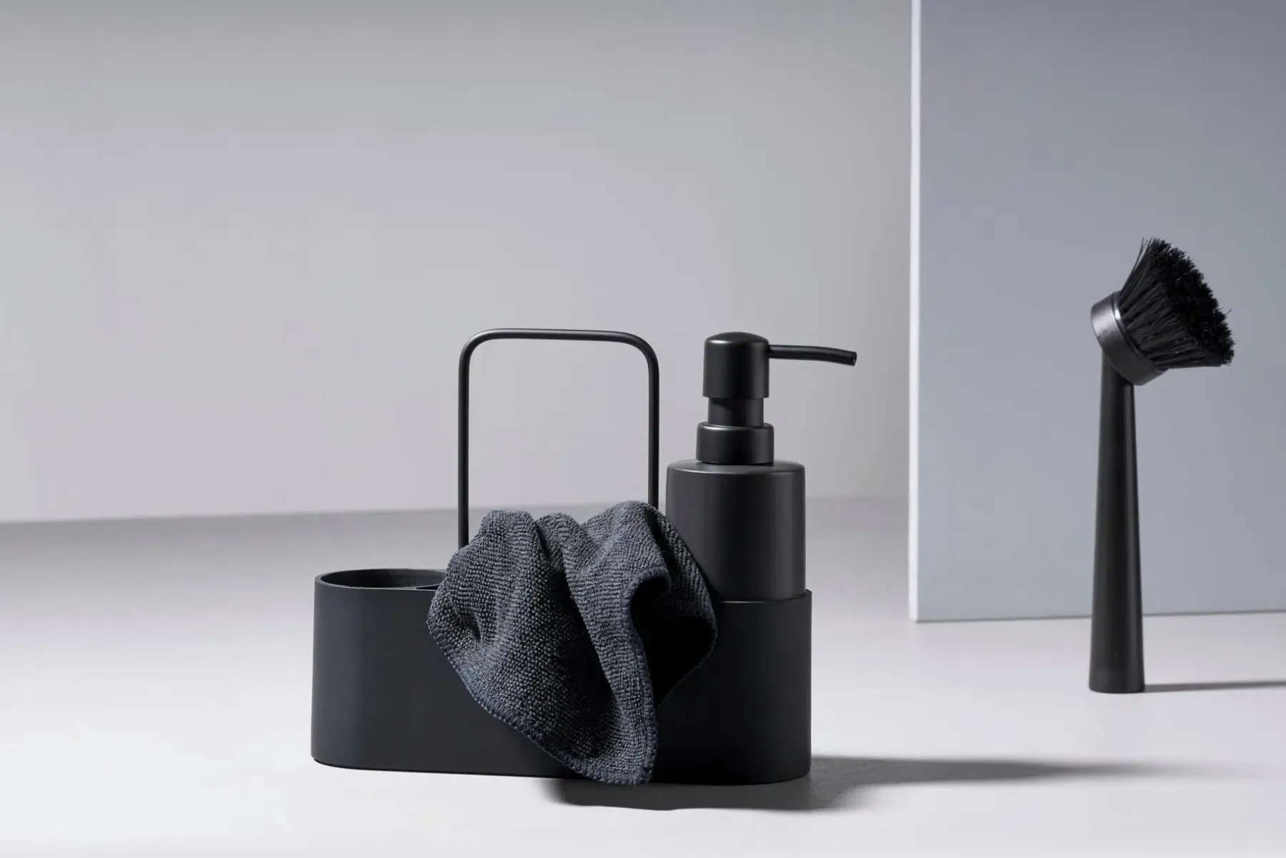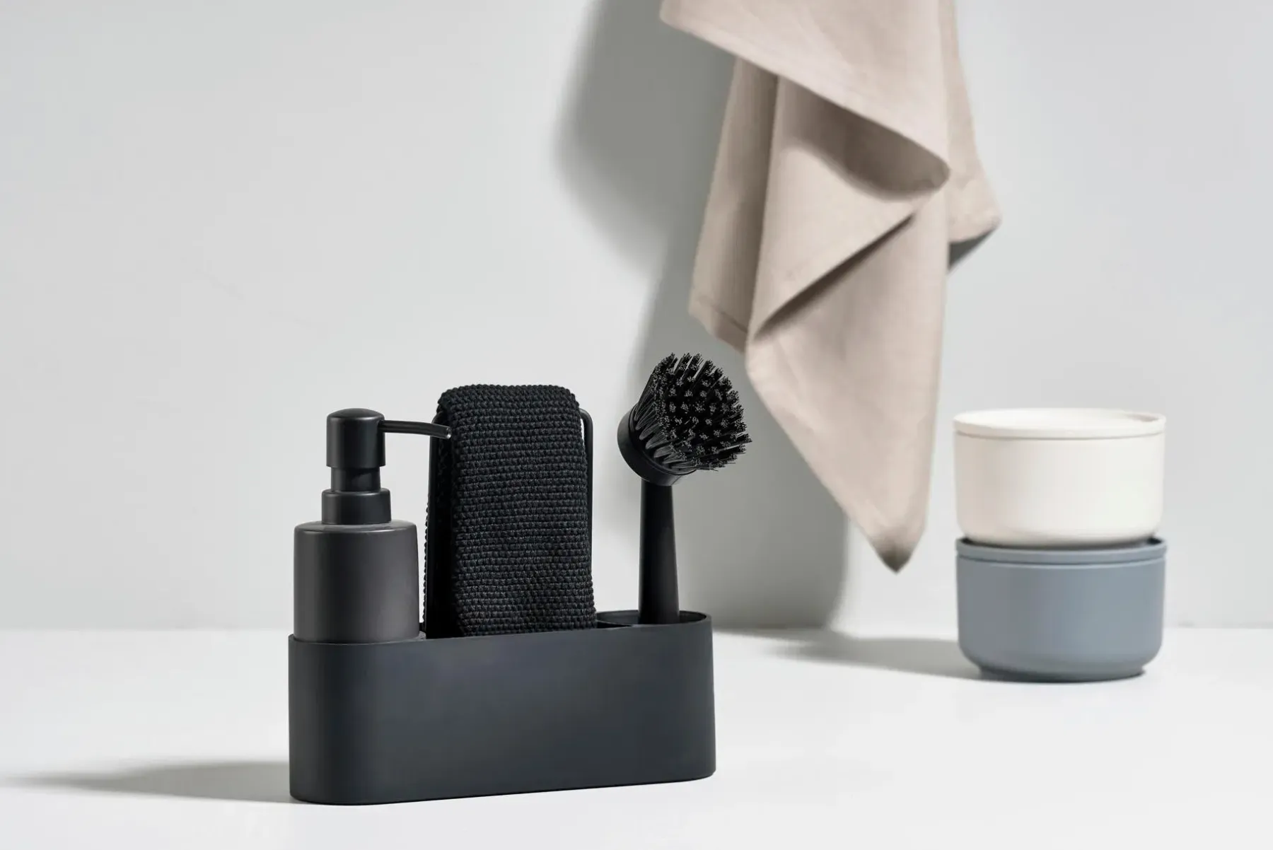 Käytännnöllinen ja kaunis tiskisetti. Telineessä on kaikki tarvittava tiskialtaasi lähellä, pumppupullo tiskiaineelle,tiskiharja ja keittiöliina